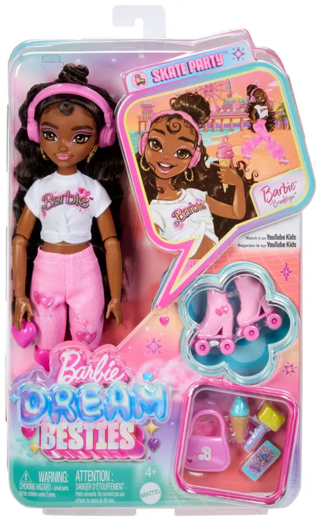 Modna lutka Barbie Brooklyn z rolerji je pripravljena na vse vrste glasbenih in plesnih dogodivščin. Z njeno obleko, navdahnjeno s srcem, ujemajočimi se rolerji in 9 dodatki, kot so stativ, slušalke, telefon in fotoaparat, si lahko otroci izmišljujejo lastne koreografije in zgodbe. Lutka ima dolge rjave lase, ki jih je mogoče oblikovati na različne načine, in ponuja ustvarjalno zabavo za igro za male ljubitelje plesa, glasbe in mode.