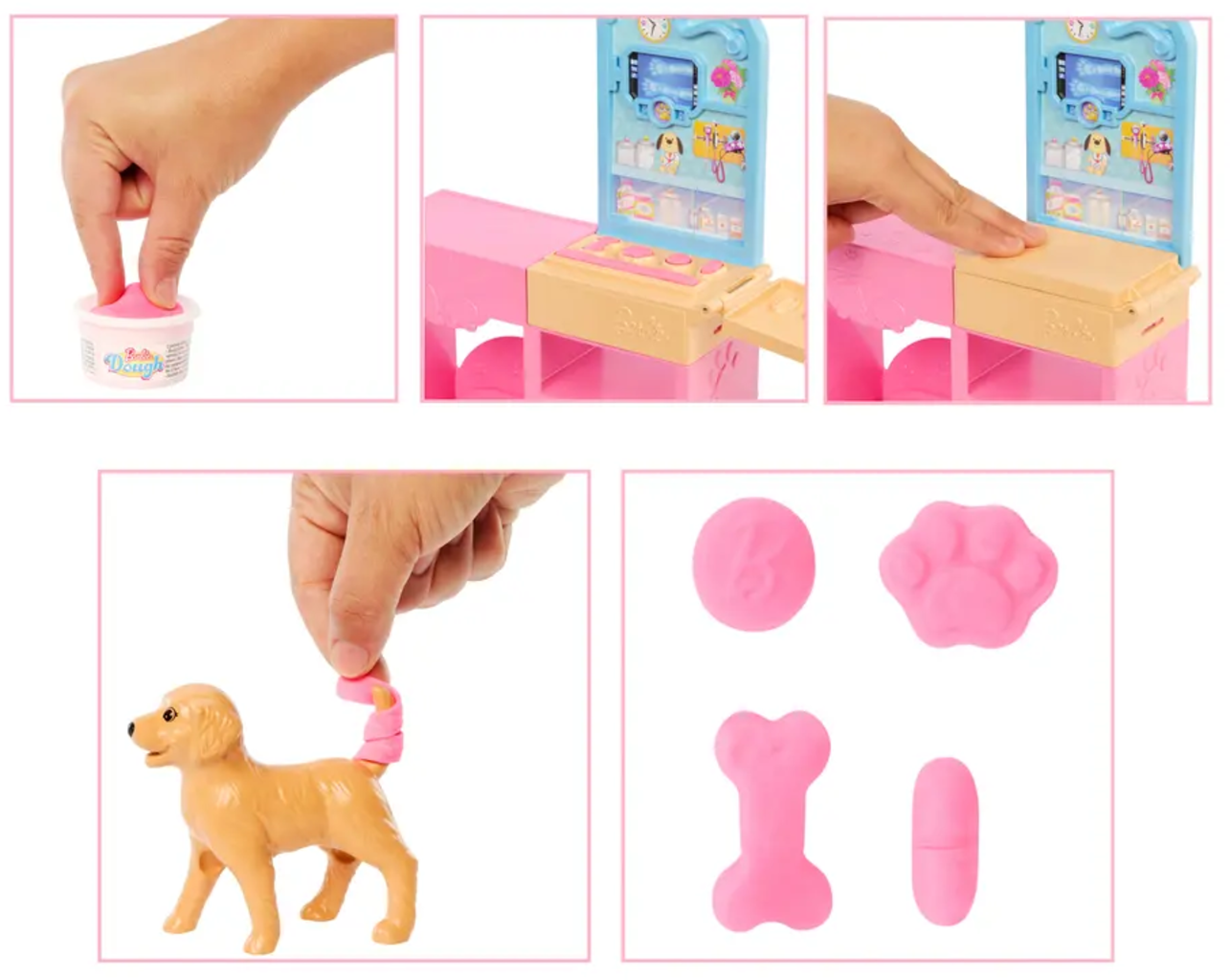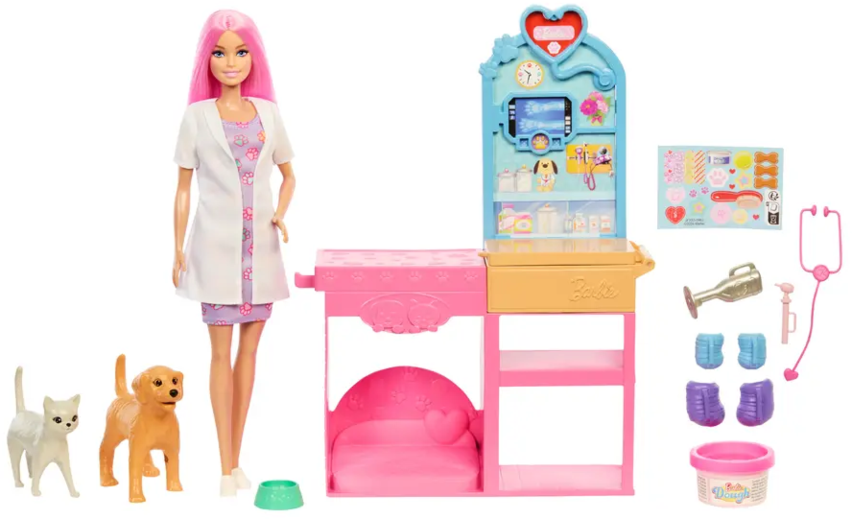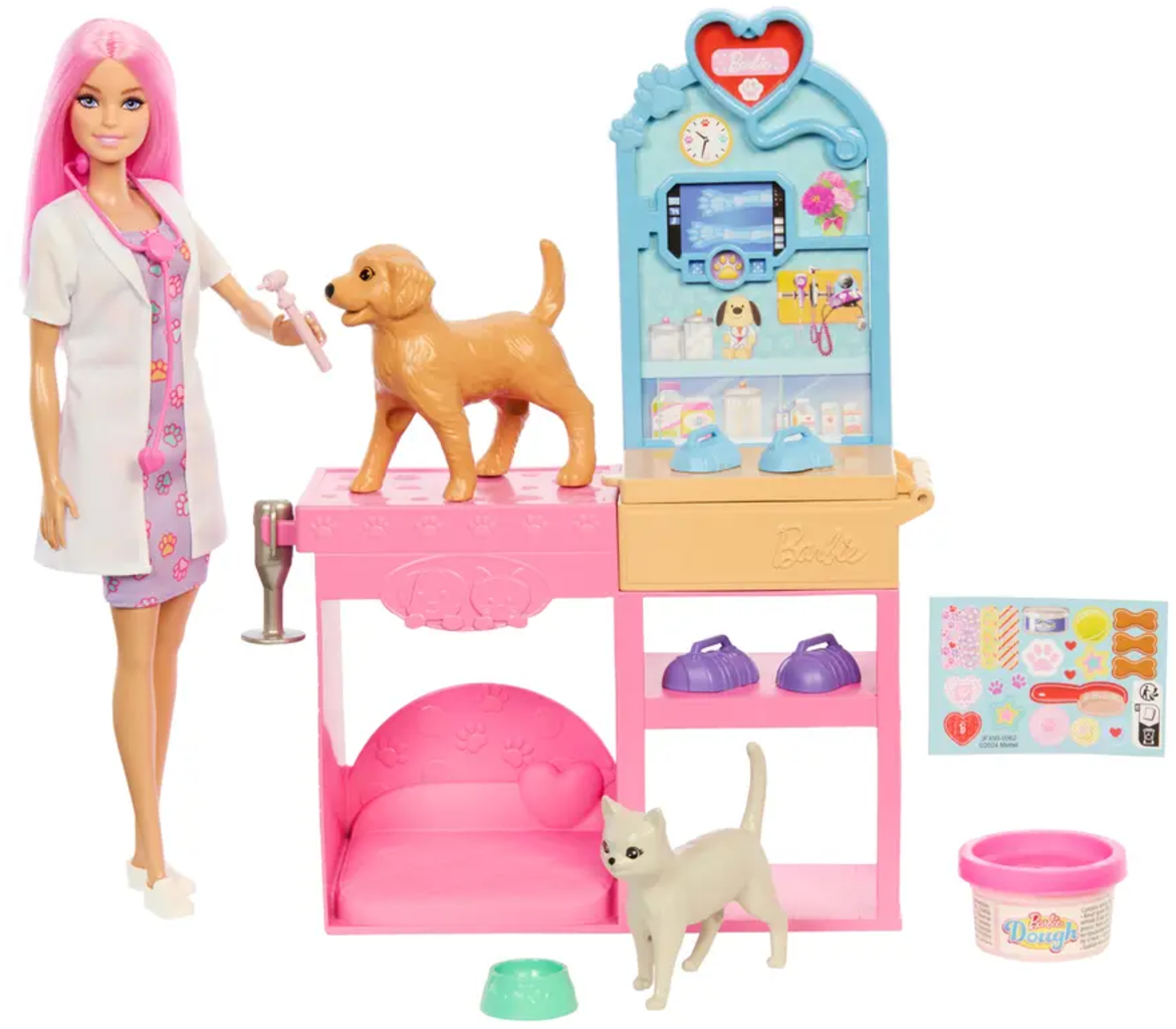 S tem igralnim kompletom se lahko otroci vživijo v vlogo veterinarja in pomagajo svojim živalskim pacientom! Ne glede na to, ali gre za kužka ali mačko, se mali ljubitelji živali na igriv način naučijo prevzemati odgovornost in doživljati razburljive dogodivščine med pregledovanjem, zdravljenjem in oskrbo. Barbie z rožnatimi lasmi otroke spremlja v kul obleki z zdravniško haljo in supergami.