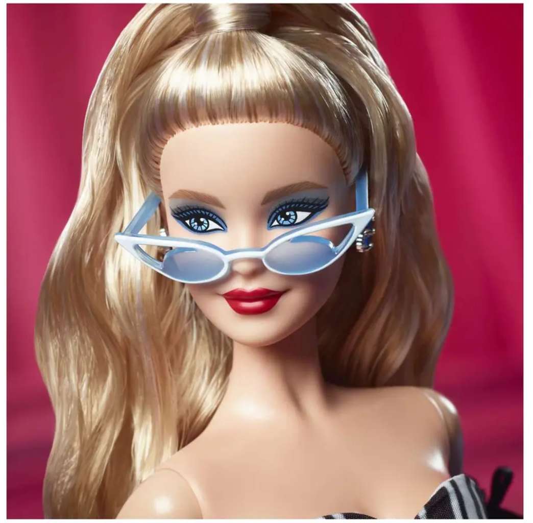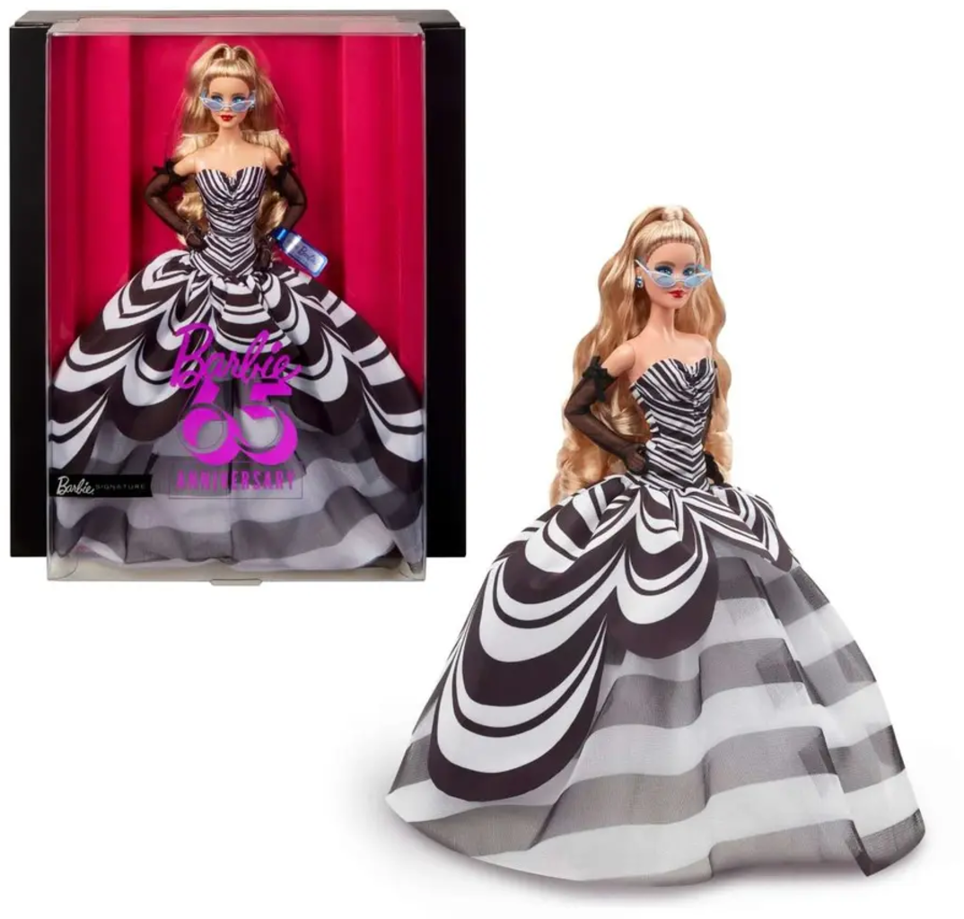 Praznujte 65 let Barbie s to ekskluzivno zbirateljsko punčko! Njena črno-bela obleka s safirno modrimi poudarki je eleganten poklon ikonični zgodbi o Barbie in vrhunec za zbiratelje in modne navdušence.