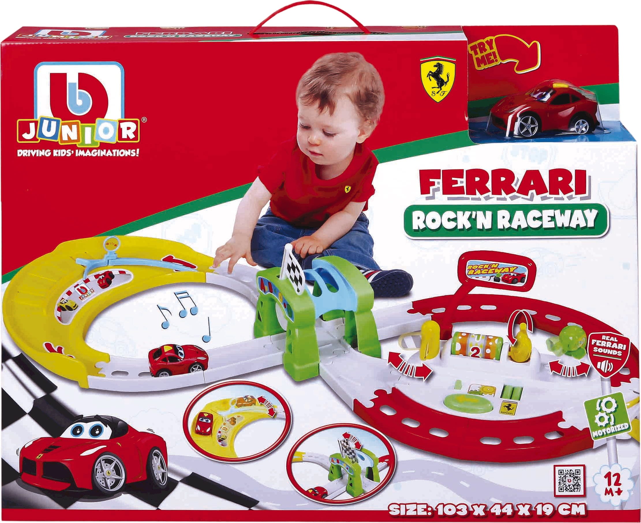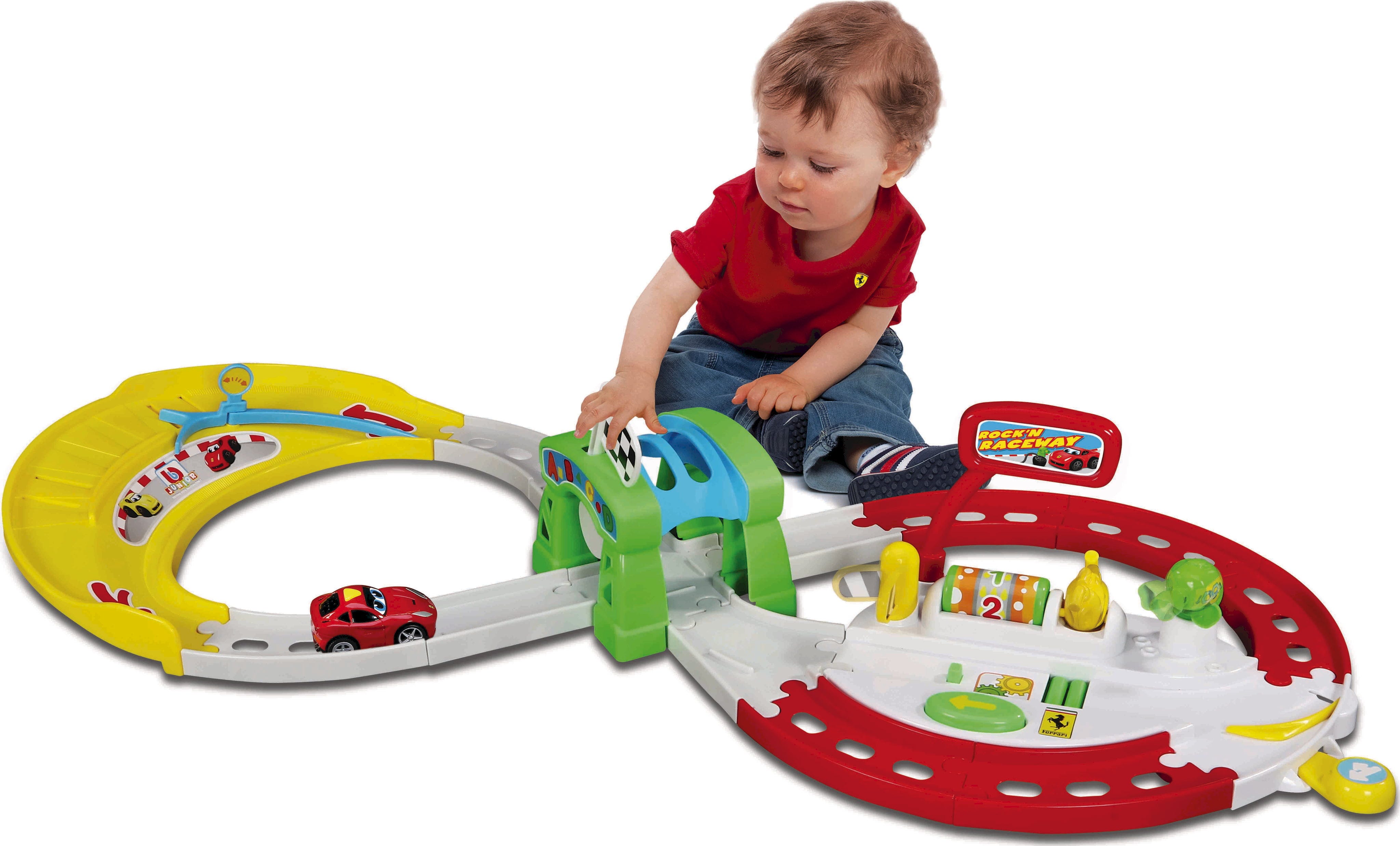 Z otrokom prilagojeno avtomobilsko stezo Ferrari Rock 'N Raceway znamke BBJunior v otroško sobo prinesite pravi dirkaški občutek. Ta igralni komplet je popoln za male ljubitelje avtomobilov od 12. meseca naprej in z raznolikimi svetlobnimi ter zvočnimi učinki nagovarja vse čute. Med vožnjo odmevajo navdušujoča glasba in zvoki motorja, ki poskrbijo za pristno vzdušje.