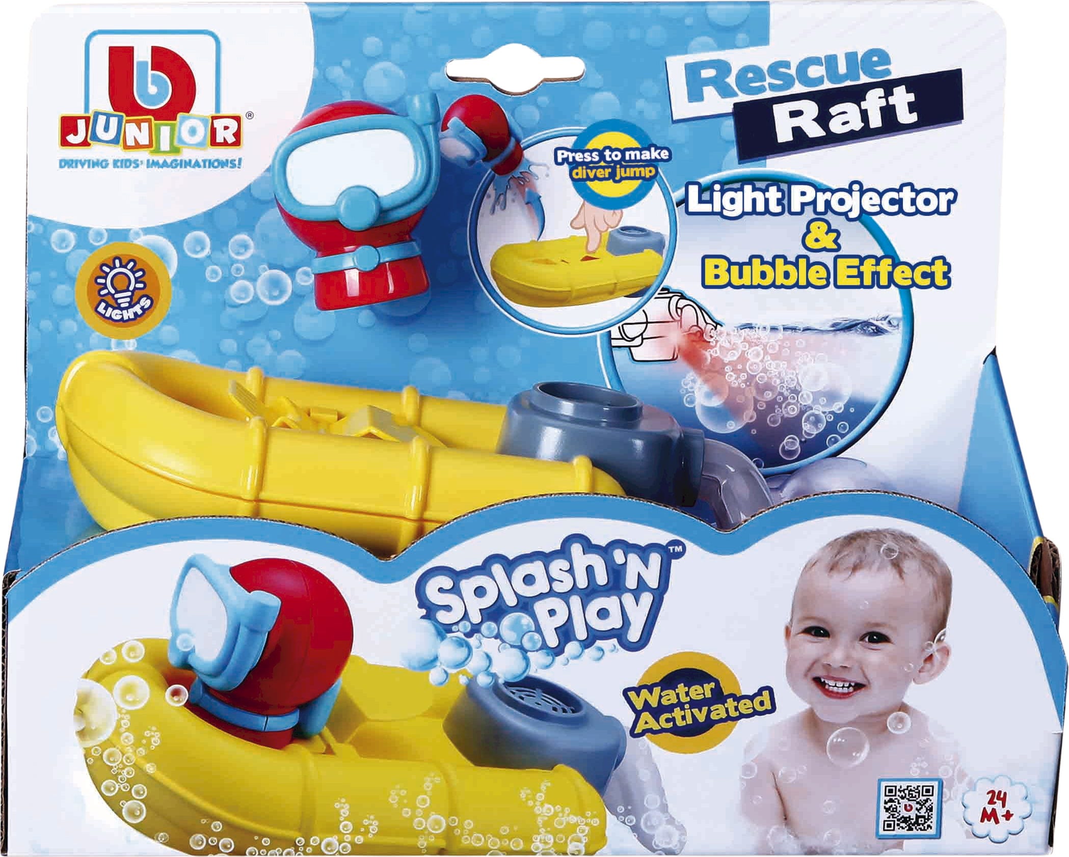 Z rešilnim splavom Splash’N Play Rescue Raft znamke BBJunior kopalna kad postane prizorišče za junaške podvige! Takoj ko barvito rešilno ladjo postavite v vodo, se začne zares: integriran svetlobni učinek in učinek brbotanja se aktivirata samodejno ter poskrbita za pravo raziskovalno vzdušje v bazenu ali kadi.