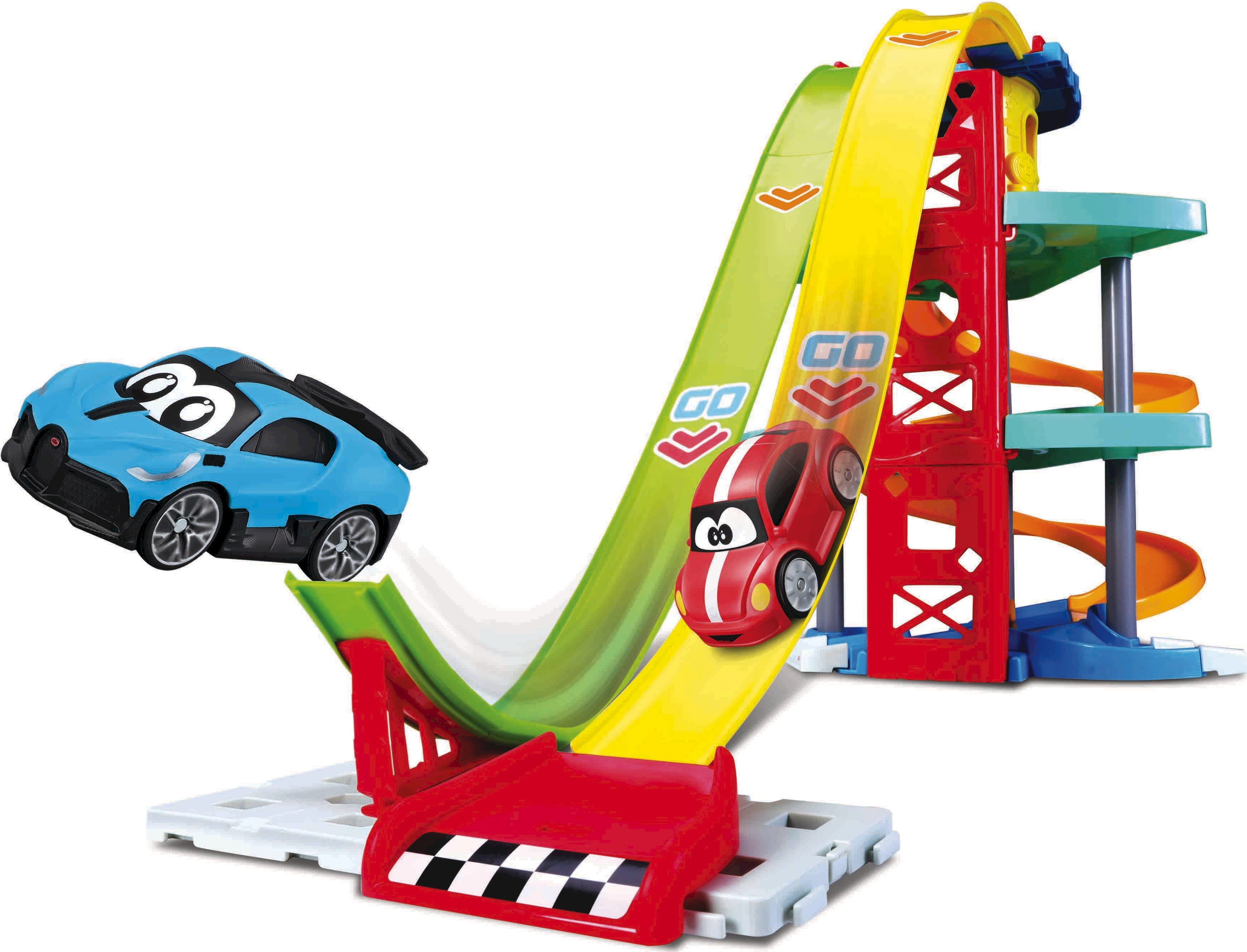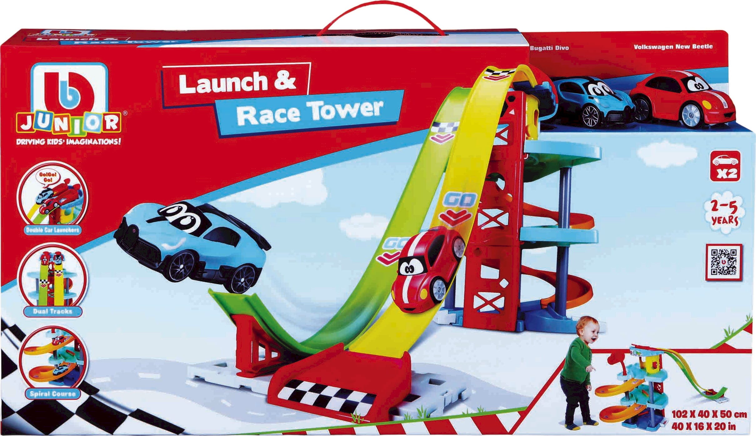 Prinesite vrhunsko hitrost v otroško sobo! S stolpom BBJunior Launch & Race Tower boste elegantnega Bugatti Diva in kultnega Volkswagna New Beetla poslali na divji spust. Dirkalnika oddrvita po spiralni stezi in uprizorita napet dvoboj vse do ciljne črte.