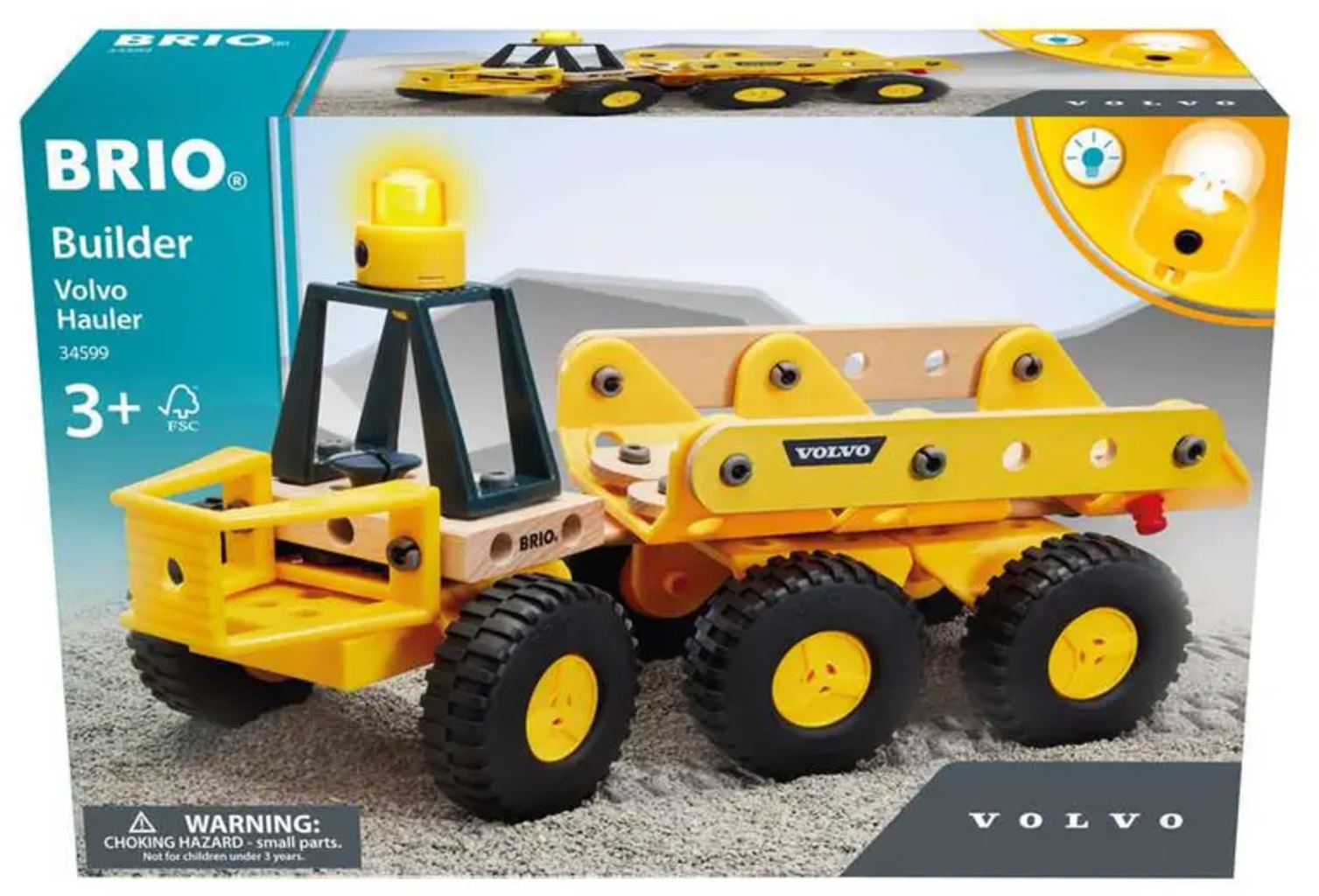 Volvo prekucnik znamke BRIO Builder je popolno gradbeno vozilo za male graditelje. S tremi velikimi pari pnevmatik se lahko spopade z vsakim gradbiščem in brez težav prevaža težke tovore. Preprosto nagnite nakladalno ploščad, vklopite opozorilno lučko in igranje vlog se lahko začne. Prekucnik je idealen za ustvarjalno gradnjo in spodbuja fino motoriko, medtem ko se otroci igrivo učijo sestavljanja in upravljanja vozila.