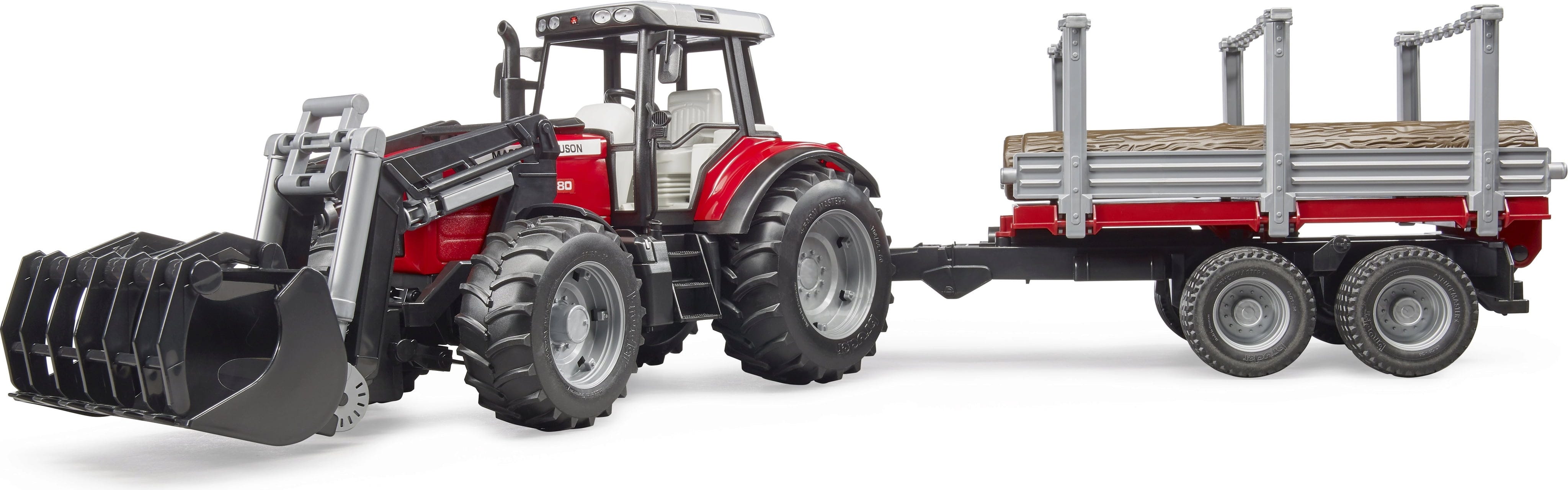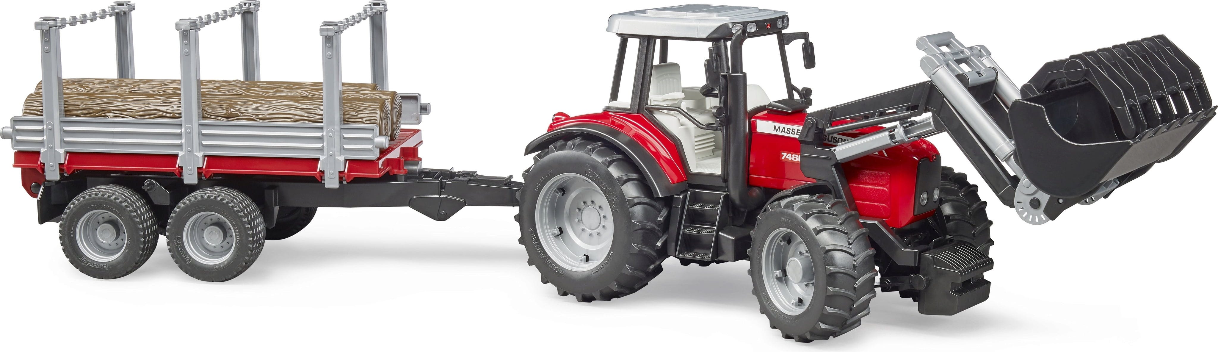Bruder 02046 Massey Ferguson 7480 s sprednjim nakladalnikom, prikolico za prevoz lesa in 3 hlodi