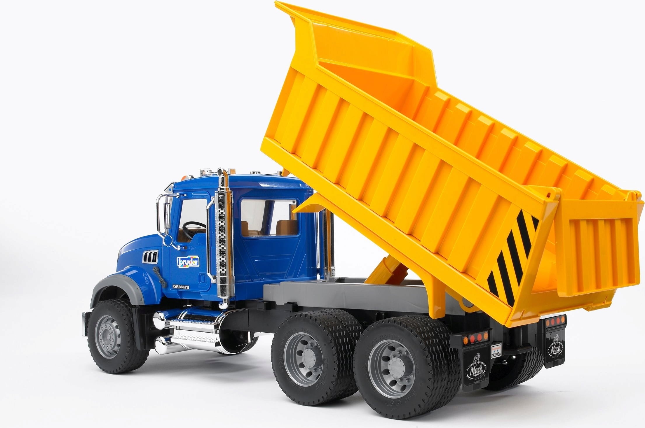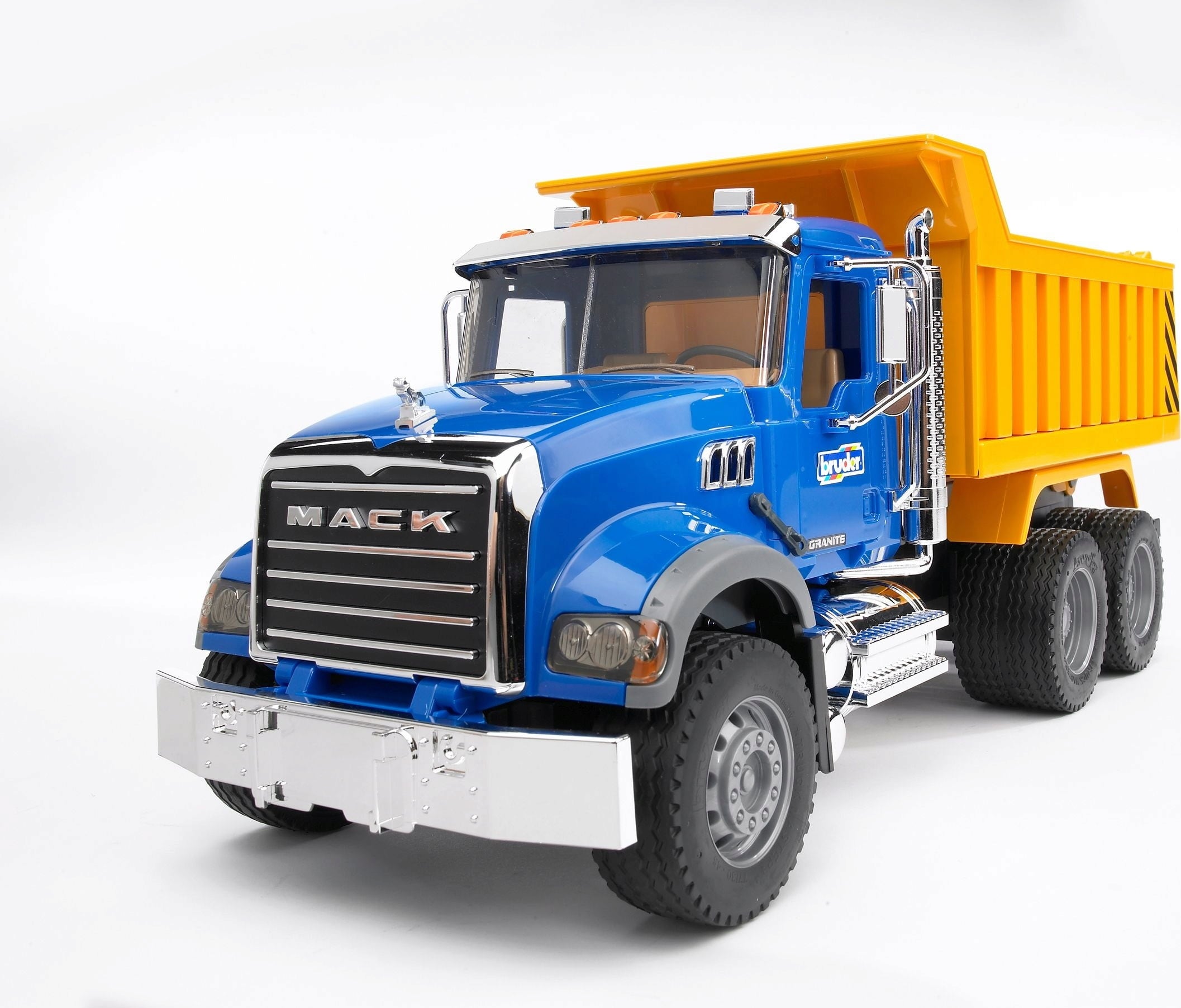 Tovornjak MACK Granit s samokolnico podjetja BRUDER prinaša moč ameriških težkih tovornjakov v otroško sobo in peskovnik. Njegova popolnoma funkcionalna samovozna nadgradnja lahko zanesljivo prevaža tudi velike količine peska ali gradnikov. Ko prispete na cilj, ga preprosto prevrnete in tovor izpraznite z odpiralnimi zadnjimi vrati.