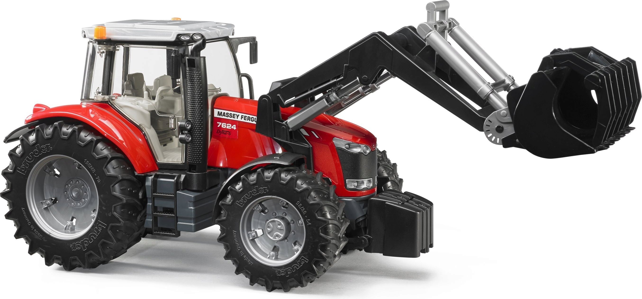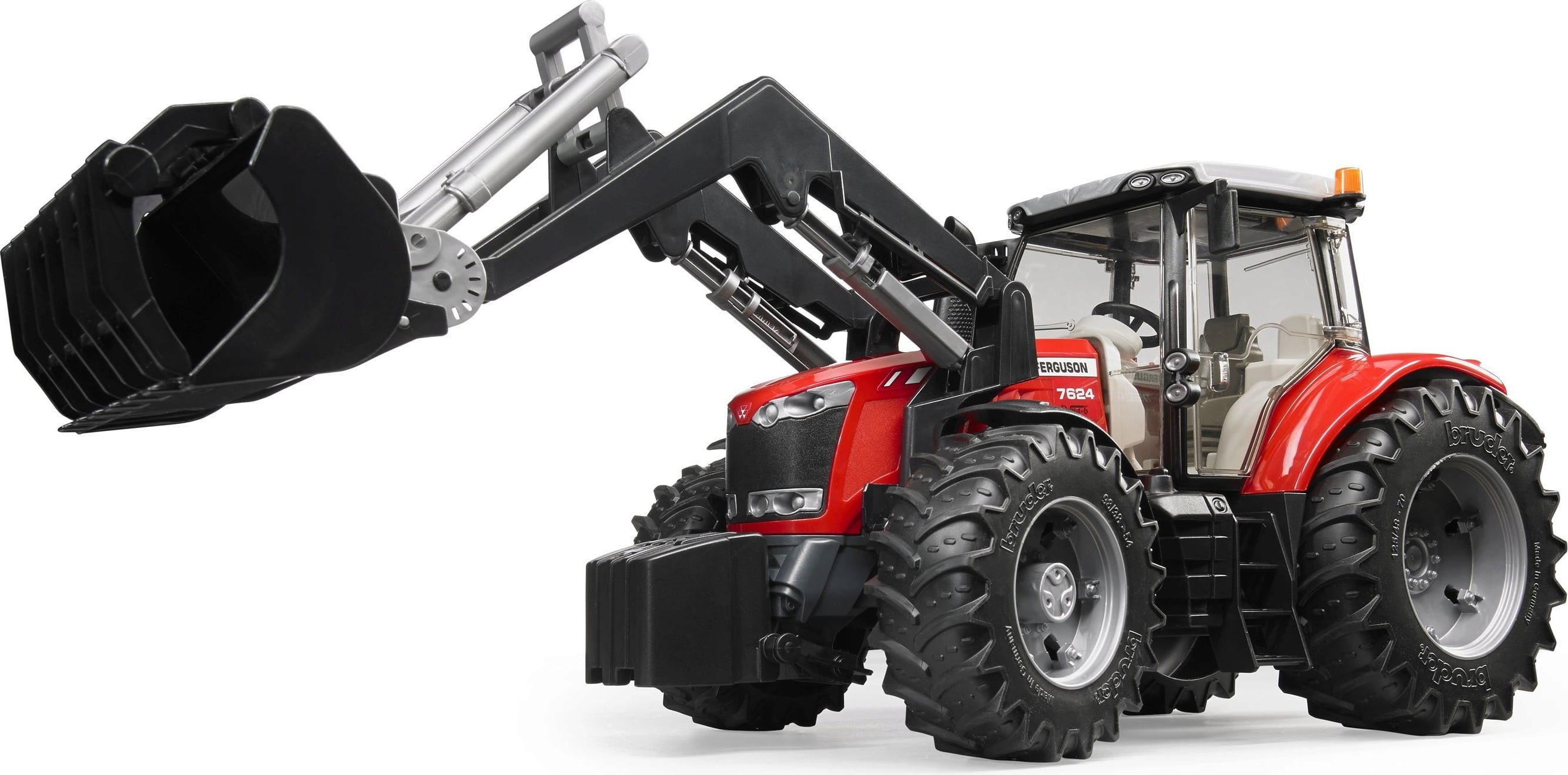 Ta zelo podroben traktor Massey Ferguson 7624 znamke BRUDER v merilu 1:16 je pravi vsestranski traktor na kmetiji igrač. S svojim premičnim in snemljivim sprednjim nakladalnikom je popolnoma primeren za vsa nakladalna opravila. Zahvaljujoč dodatnemu volanskemu drogu ga je mogoče enostavno krmiliti skozi strešno loputo.