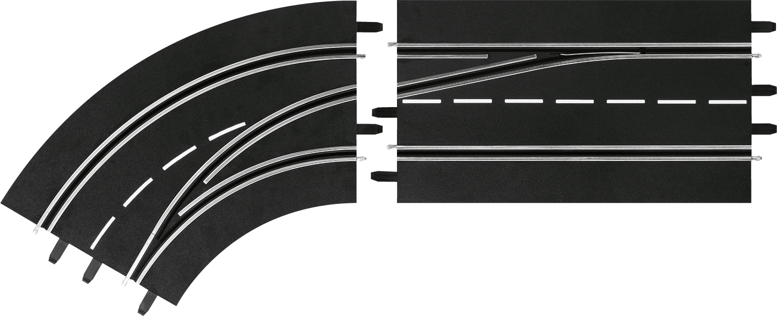 Menjaj vozni pas in prehiti nasprotnike. Ta ovinek za menjavo voznega pasu je sestavljen iz dveh odsekov steze in ponuja možnost prehitevanja z zunanjega na notranji pas. Primeren je tudi za digitalno nadgrajeno stezo Carrera EVOLUTION.