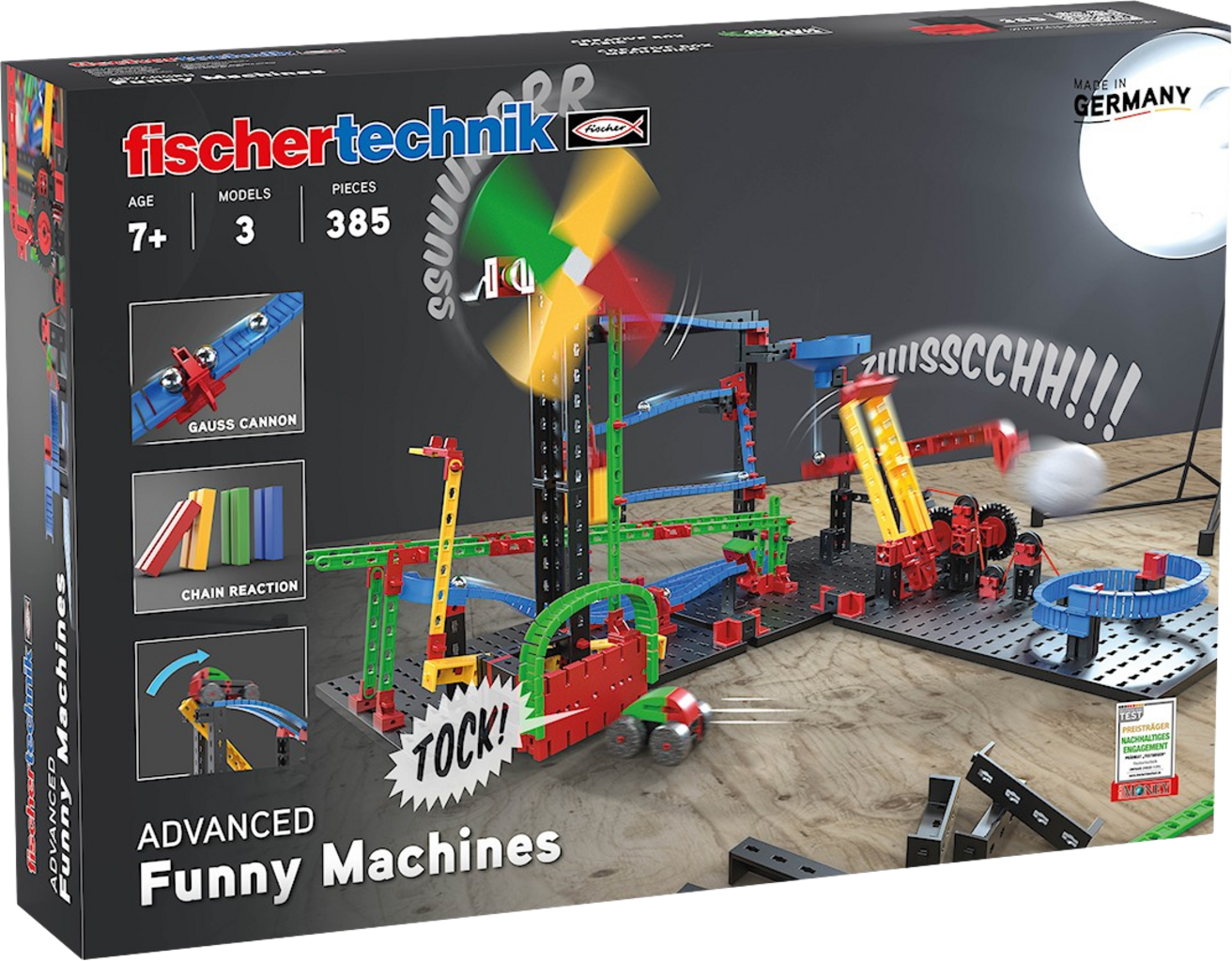 S kompletom Funny Machines - Chain Reaction se otroci potopijo v svet verižnih reakcij. Že majhen sunek sproži verigo dejanj: žogice se kotalijo po tirnicah, trkajo v kocke, sprožijo domino efekt in aktivirajo katapulte - vse to v otroški sobi. Navodila za sestavljanje omogočajo tri različne modele, ki jih je mogoče ustvarjalno razširiti, tudi z doma narejenimi materiali, kot so domine. Barvit, izobraževalen komplet, ki mladim izumiteljem prinaša zabavo in občutek dosežka med sestavljanjem.