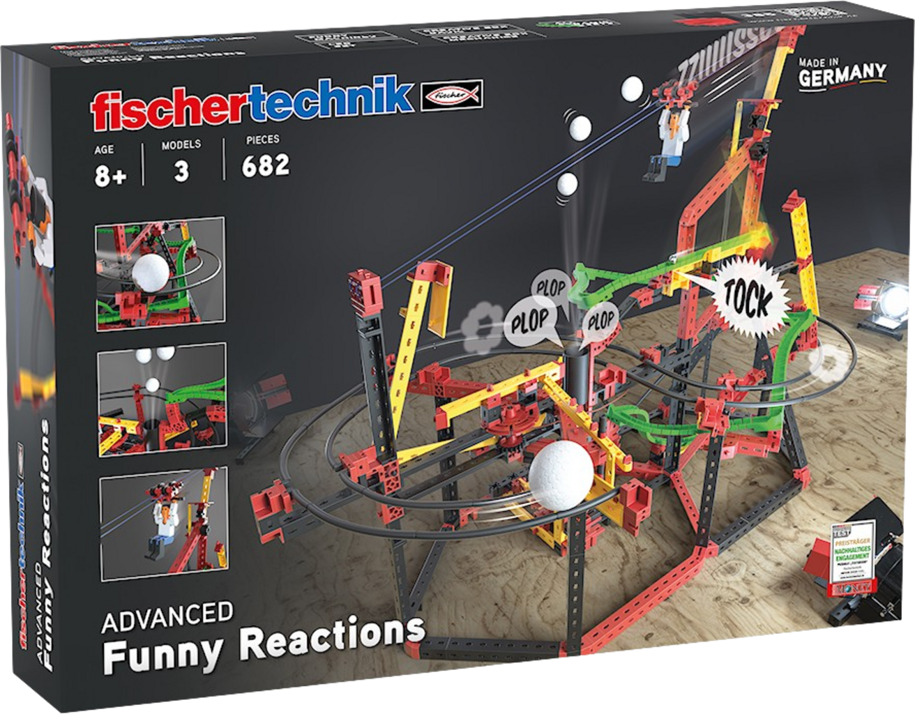 S kompletom Funny Reactions znamke fischertechnik lahko v vsako otroško sobo vnesete akcijo! Že majhen potisk je dovolj, da sprožite vznemirljivo verižno reakcijo - ustvarjalno, pametno in polno presenečenj. Trije modeli se lahko razširijo na več načinov in zagotavljajo ure zabave. Idealno za male izumitelje, ki radi eksperimentirajo, odkrivajo in se čudijo.