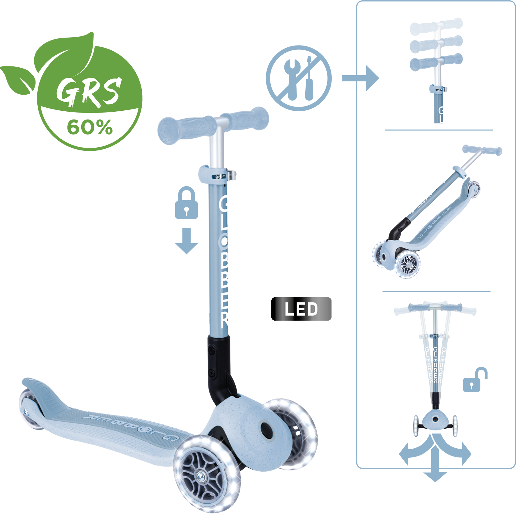 Zložljiv skiro Junior Foldable Lights Eco združuje varnost z okoljsko ozaveščenostjo. Izdelan je iz recikliranih materialov in ponuja stabilen način za vadbo mobilnosti za otroke od 2. leta starosti - z dodatno zabavo zaradi LED luči na kolesih.