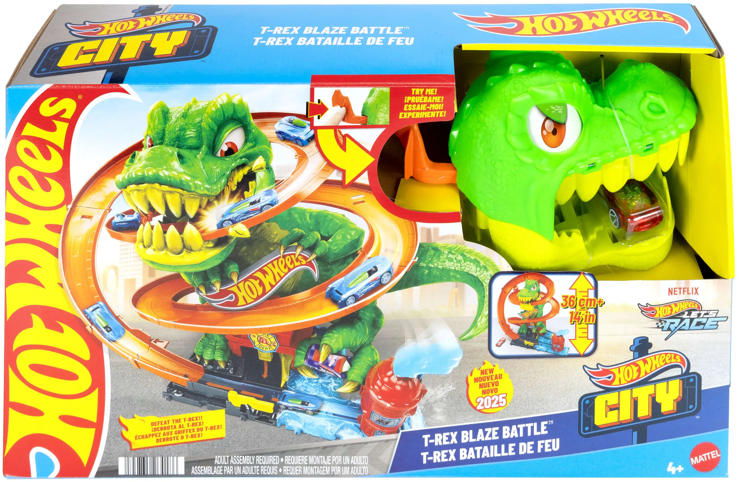 S Hot Wheels City T-Rex Fire Battle vas čaka akcijska pustolovščina: velikanski dinozaver ogroža mesto! Otroci pošljejo priloženo gasilsko vozilo na dirko in doživijo tri vznemirljive izide - da ga pojedo in "izstopijo zadaj", da se ustavijo za oskrbo z gorivom ali da premagajo pošast enkrat za vselej. Dinozavrove oči in roke se premikajo z vsakim krogom, dokler se končno ne zruši. Igralni set ima tudi prostor za več avtomobilov in veliko podrobnosti za ustvarjalno pripovedovanje zgodb.