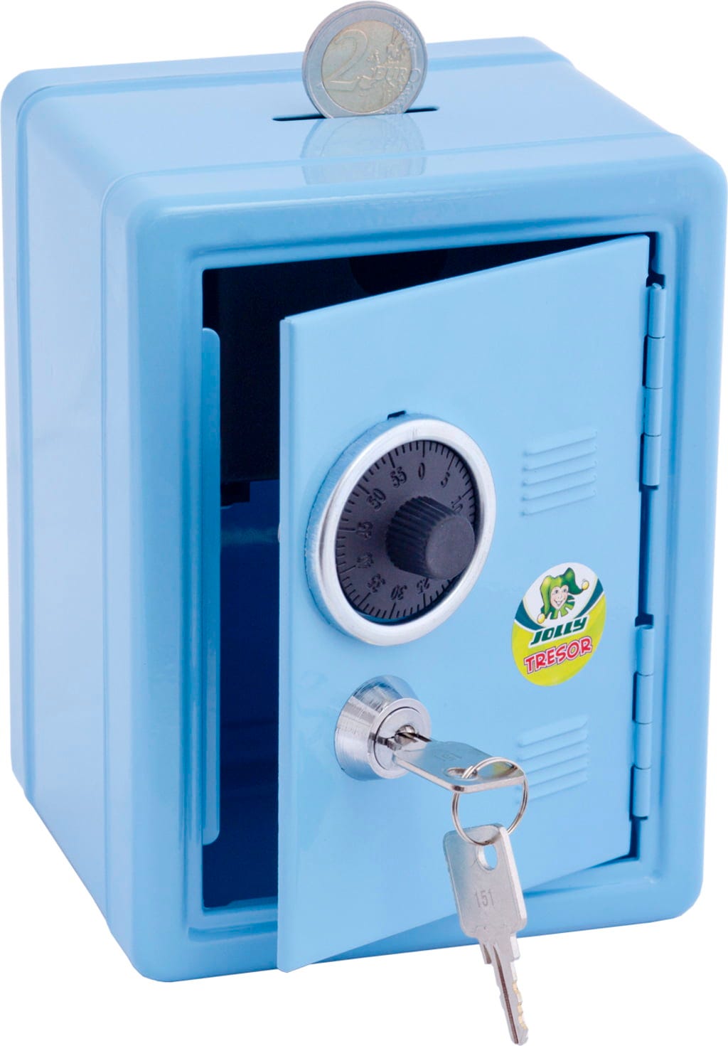 Čudovit hranilnik v obliki sefa v barvani kovini, opremljen s ključem in kombinacijsko ključavnico za varno shranjevanje majhnih prihrankov.