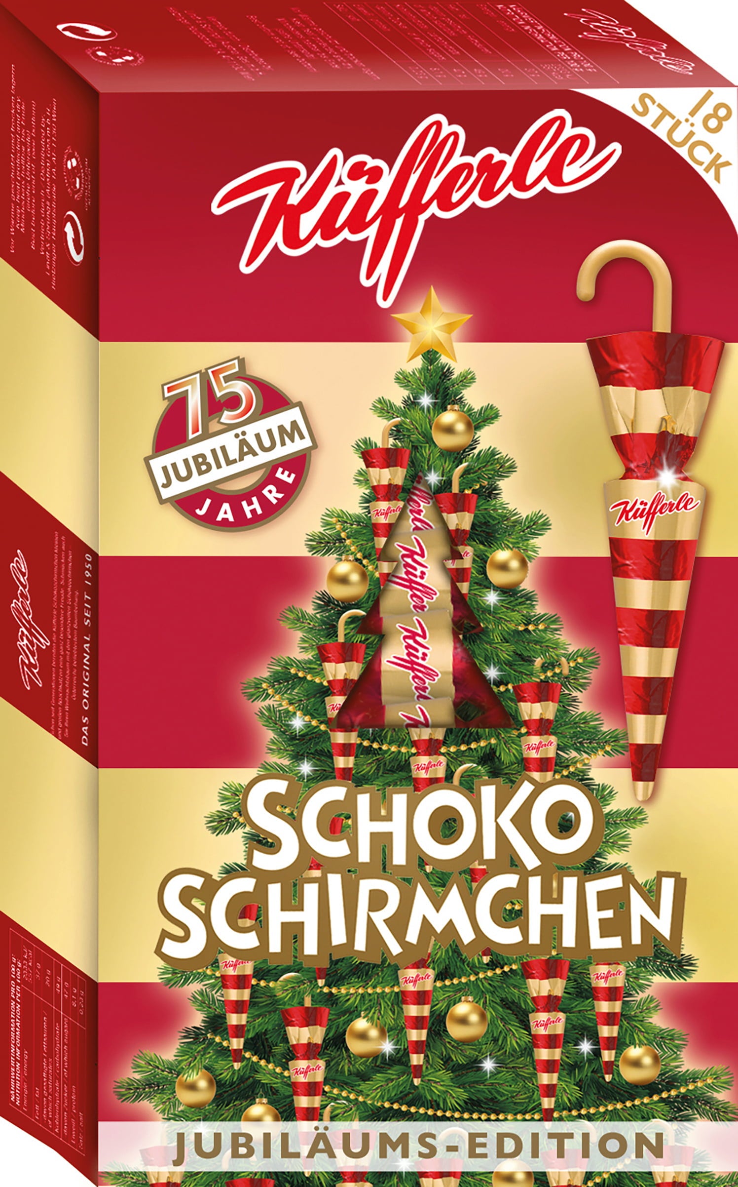 Praznujte 75. obletnico slavnih čokoladnih dežnikov Küfferle in se prepustite tej ekskluzivni jubilejni izdaji. Priljubljeni čokoladni dežniki se ponašajo s klasičnim črtastim dizajnom, tokrat v rdeči in zlati barvi. Popolni so za dodajanje posebnega pridiha vaši božični jelki in za še več veselja v tem prazničnem času.