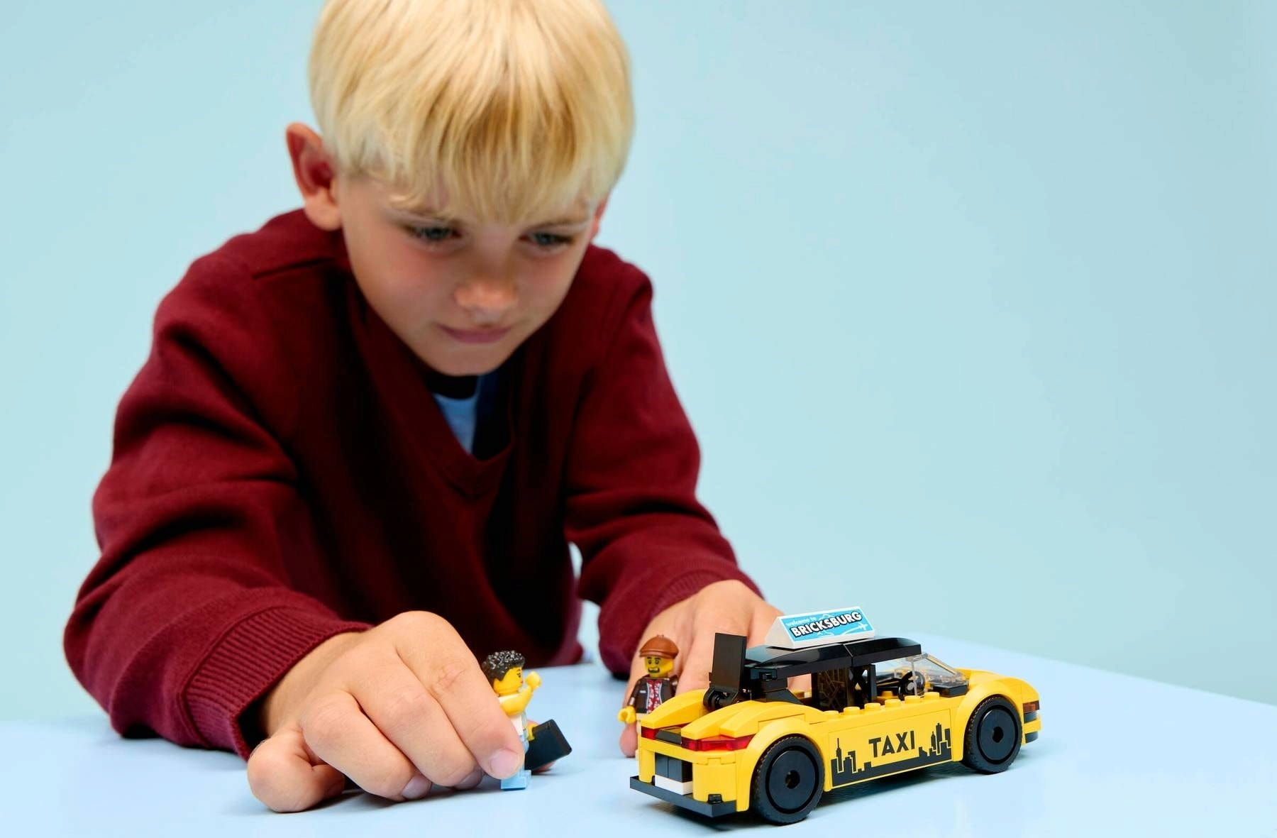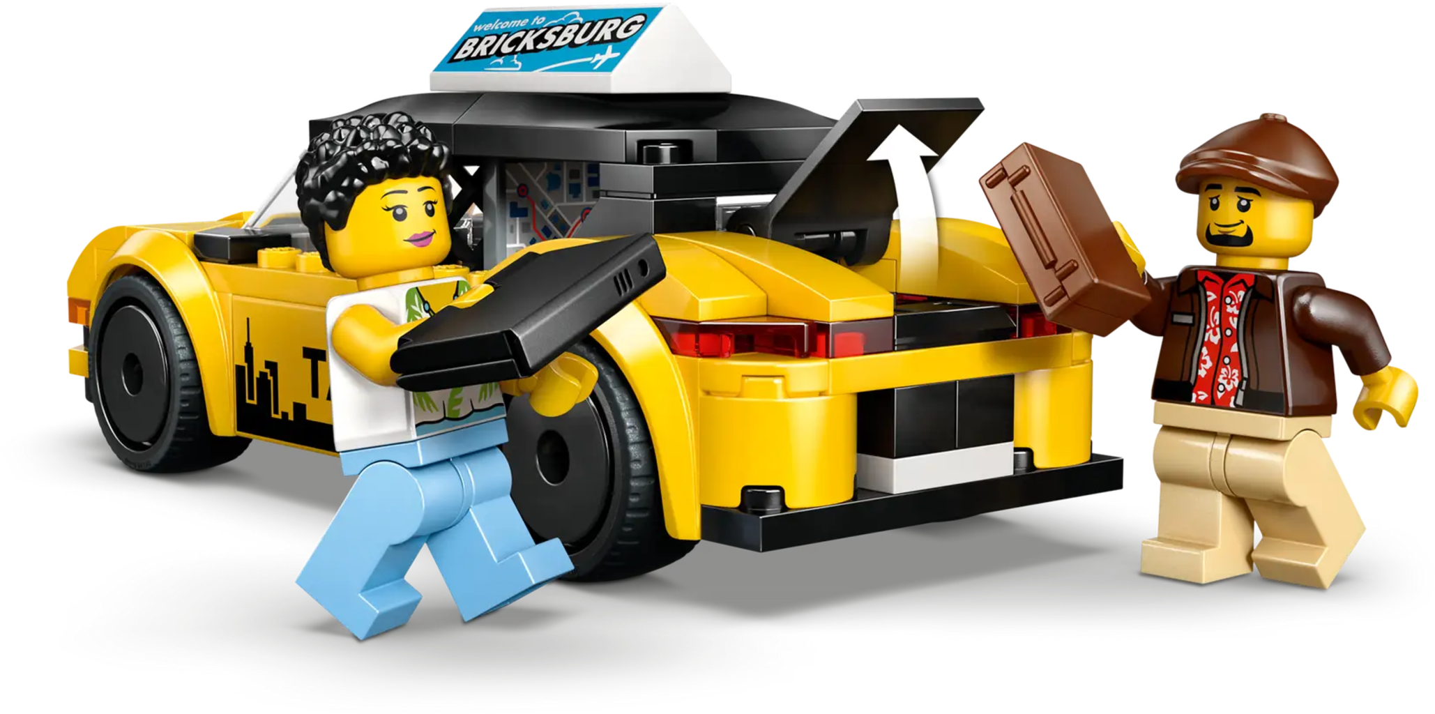Komplet vsebuje sestavljiv električni avtomobil z odpirajočim se prtljažnikom, dvižnim pokrovom motorja in snemljivo streho. Minifigure taksista in turista ter realistične podrobnosti spodbujajo domišljijsko igro in pripovedovanje zgodb o mestu.