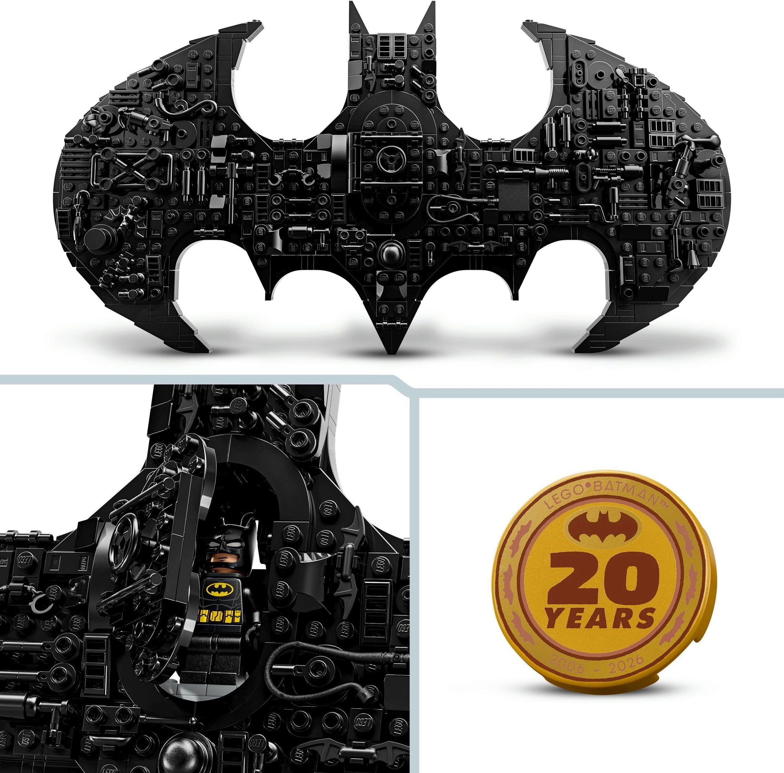 Ob 20-letnici serije LEGO Batman lahko s tem kompletom pošljete ultimativni Bat-signal! Premični elementi, kot so Batarangi ali kladivo Harley Quinn, zagotavljajo kreativno svobodo pri oblikovanju, model pa lahko razstavite na priloženem stojalu ali ga pritrdite na steno. V loputo na sredini logotipa, ki se poklanja legendarnemu sefu za obleke v Batcave, se popolnoma prilega klasična minifigurica Batmana z jubilejnim kovancem. Komplet vsebuje tudi ekskluzivno zlato jubilejno figurico in prav posebno poslastico: s skeniranjem QR-kode v navodilih lahko zlati lik odklenete v videoigri "LEGO Batman – Legacy of the Dark Knight".