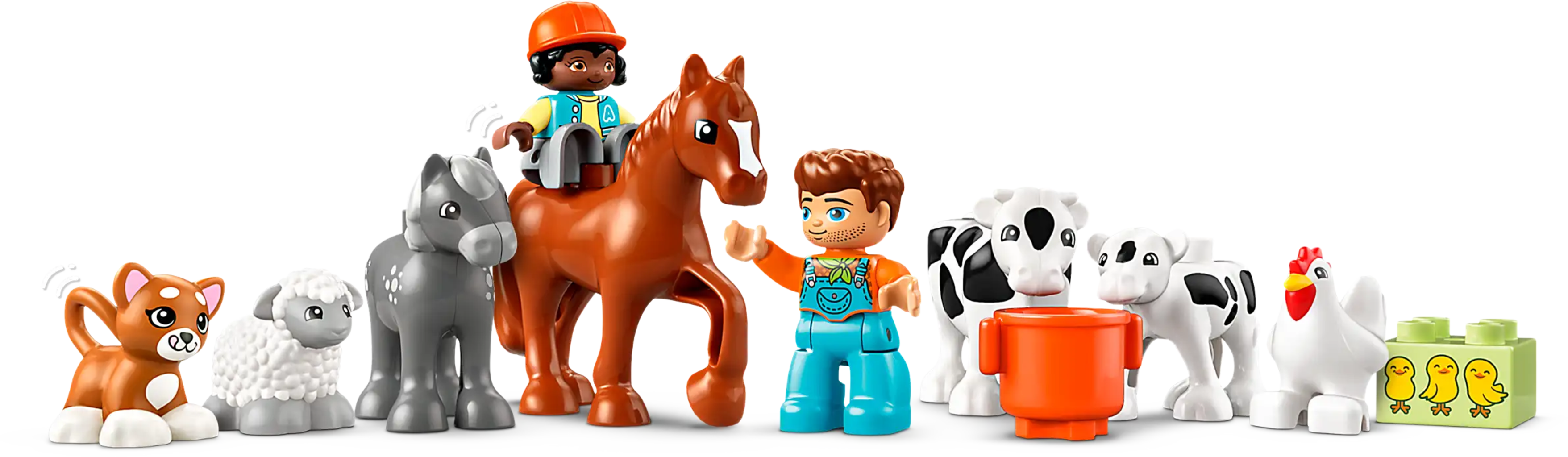Komplet LEGO® DUPLO® Skrb za živali na kmetiji je popoln za malčke, stare 2+, ki imajo radi kmetijo in živali. Vključuje 8 figur živali, kot so konj, ovca, krava in kokoš, ter številne igralne možnosti. Malčki se učijo, kako skrbeti za živali, ko pomagajo kmetu pri hranjenju in negovanju živali. Z igro na kmetiji razvijajo finomotorične spretnosti in veščine reševanja težav.