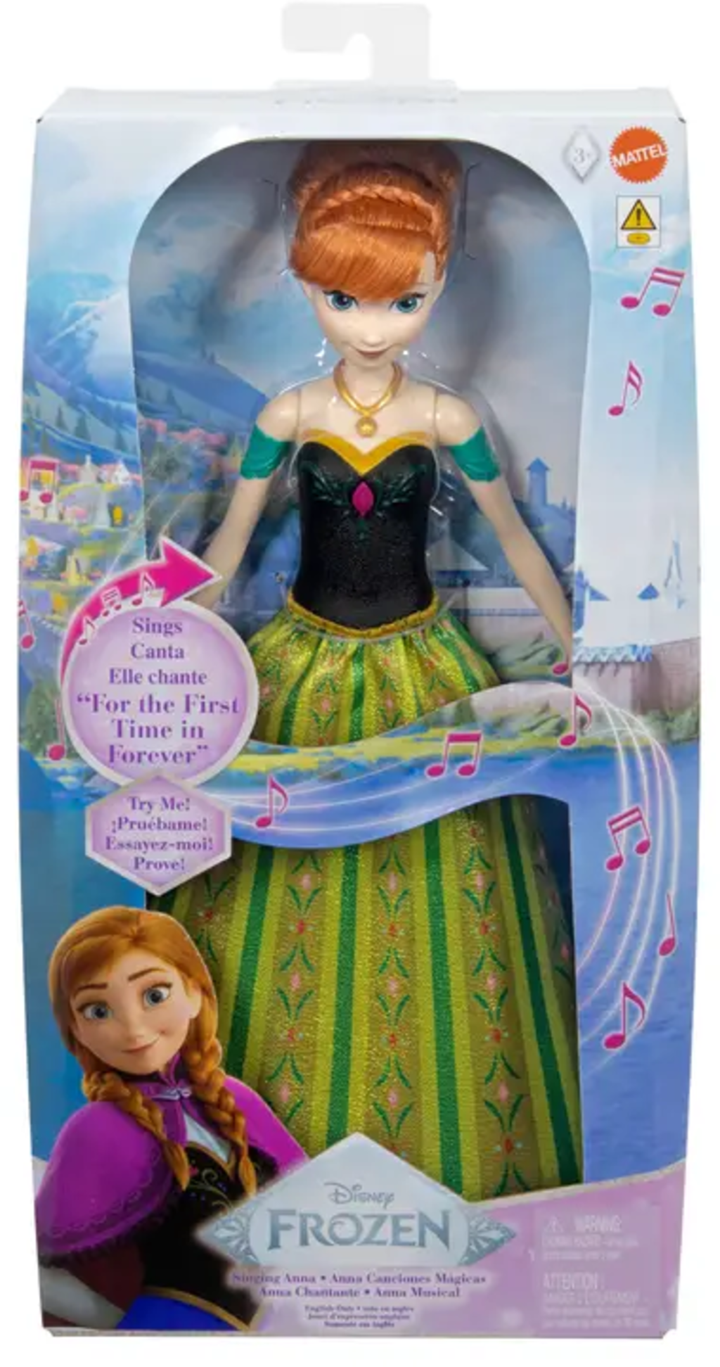 S pojočo punčko Ano lahko otroci podoživijo čarobne trenutke iz "Ledenega kraljestva" ali si izmislijo lastne pustolovščine v Arendellu. Razkošna obleka, elegantna pričeska in priljubljena pesem "For the first time in forever“ zagotavljajo ure in ure zabave ob igri in prepevanju.