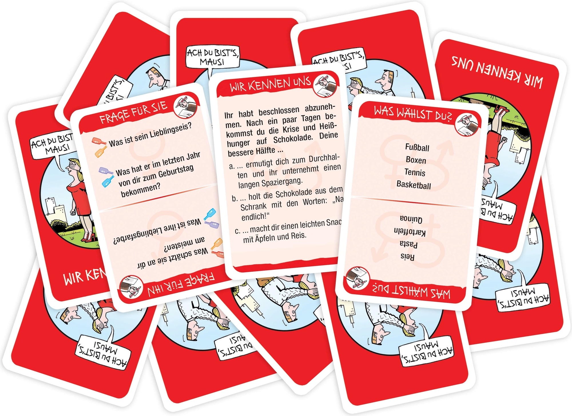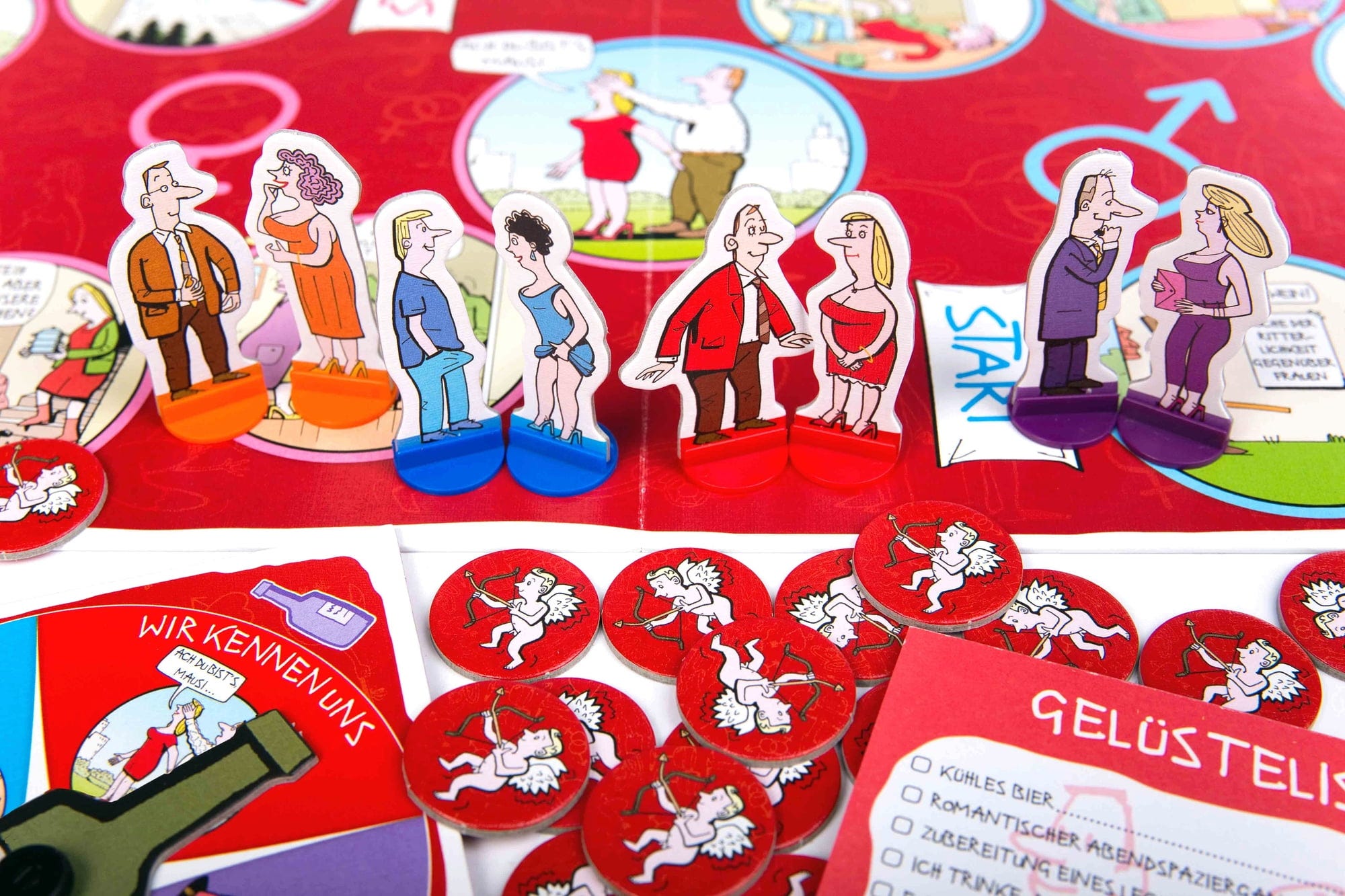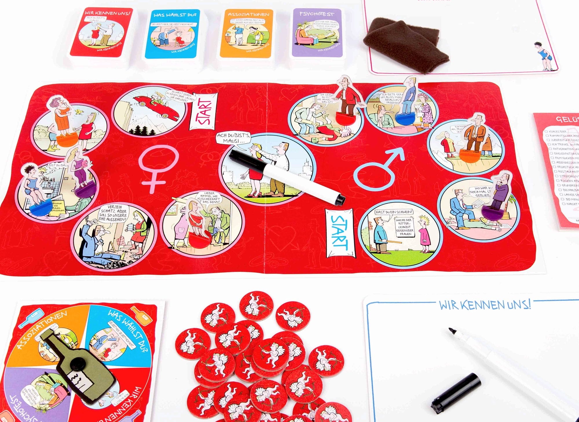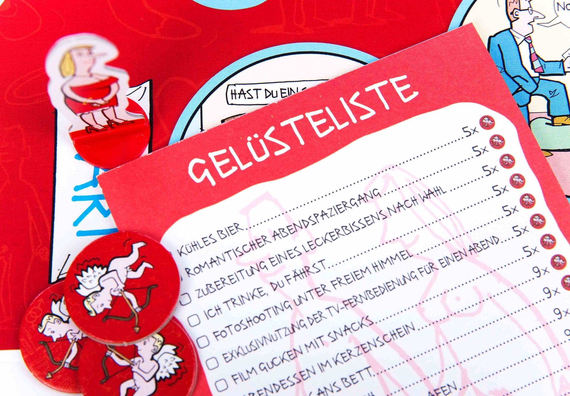 Vsebina: dvostranska igralna plošča, 8 igralnih kosov, 220 kart, 60 kupidovih žetonov, vrtavka za steklenice, 2 risalni deski, 2 izbrisljiva markerja, čistilna krpa, 25-stranski blok z boni