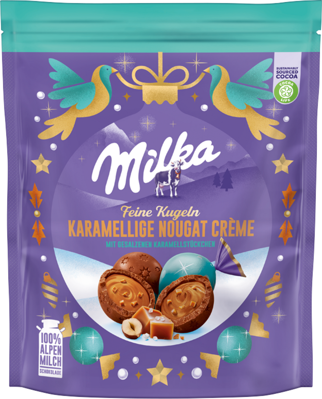 Milka Polnjene božične kroglice - karamela in nougat, 90 g