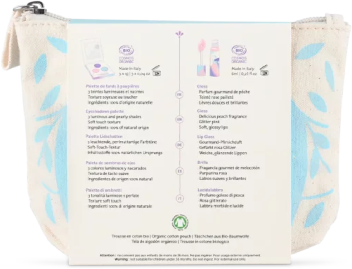 Ta lična kozmetična torbica vsebuje set otroških ličil: tri senčila v sijočih in lesketajočih se odtenkih ter bleščeč lip gloss z vonjem breskve. Vsi izdelki so nežni do otroške kože, hipoalergeni in jih je enostavno spirati. Zaradi tega je komplet lahko tudi popolno darilo.