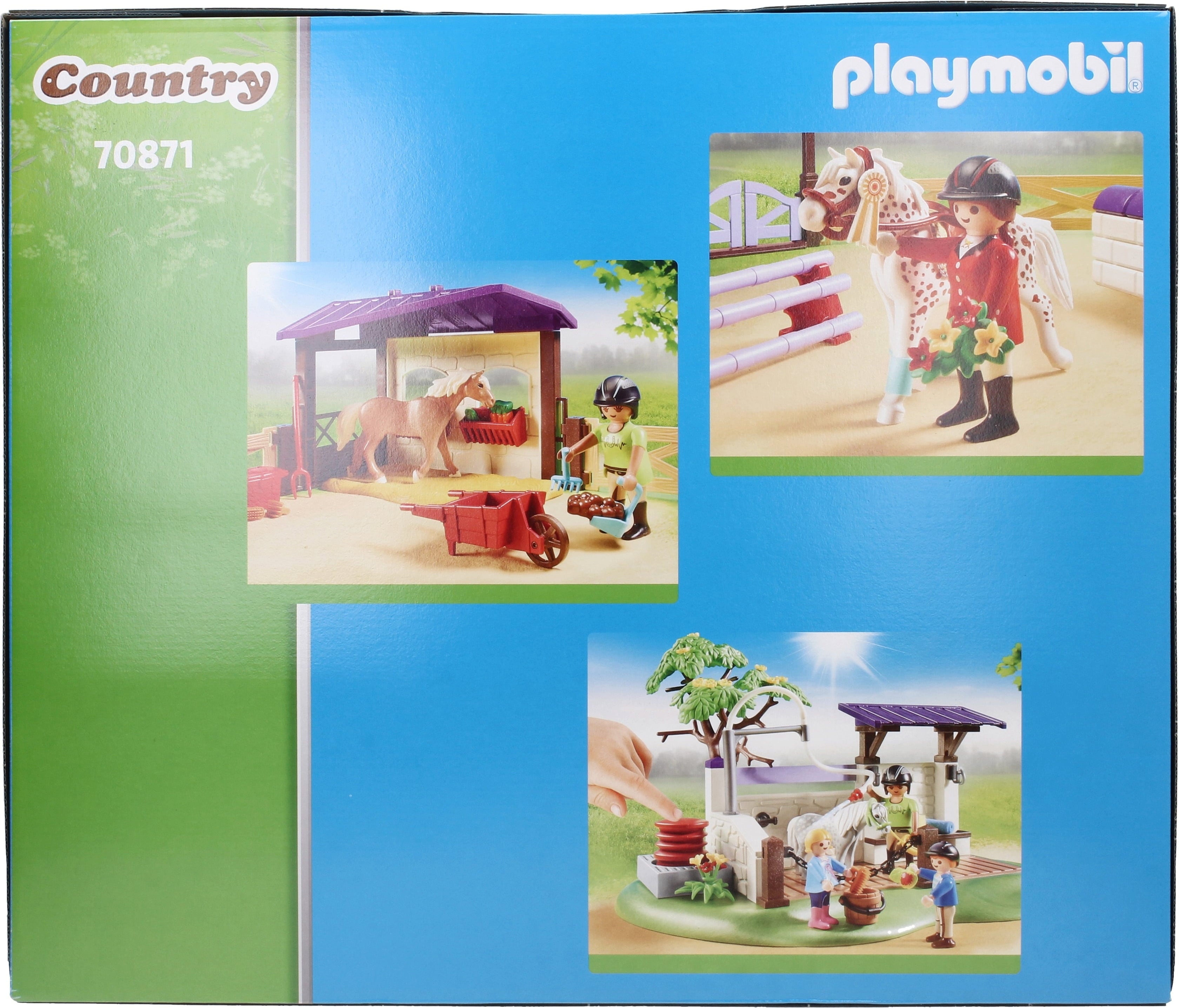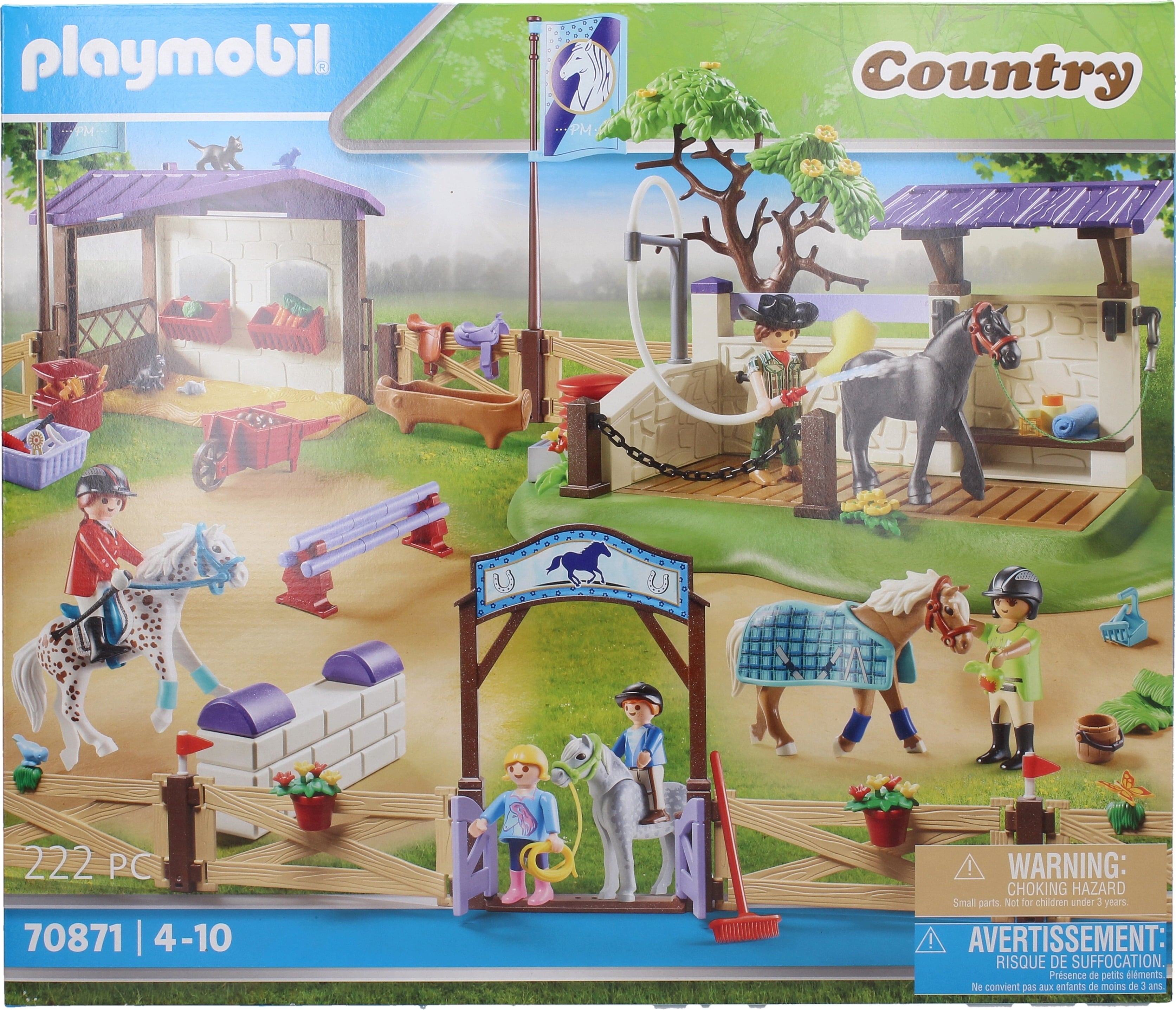 S tem obsežnim kompletom PLAYMOBIL Country se lahko otroci potopijo v svet konjeniškega športa. Ponuja popolno kuliso za vznemirljive konjske predstave in druga tekmovanja. Vključuje tudi hlev in praktičen prostor za umivanje. Priložene so tudi ujemajoče se figure z dodatki.