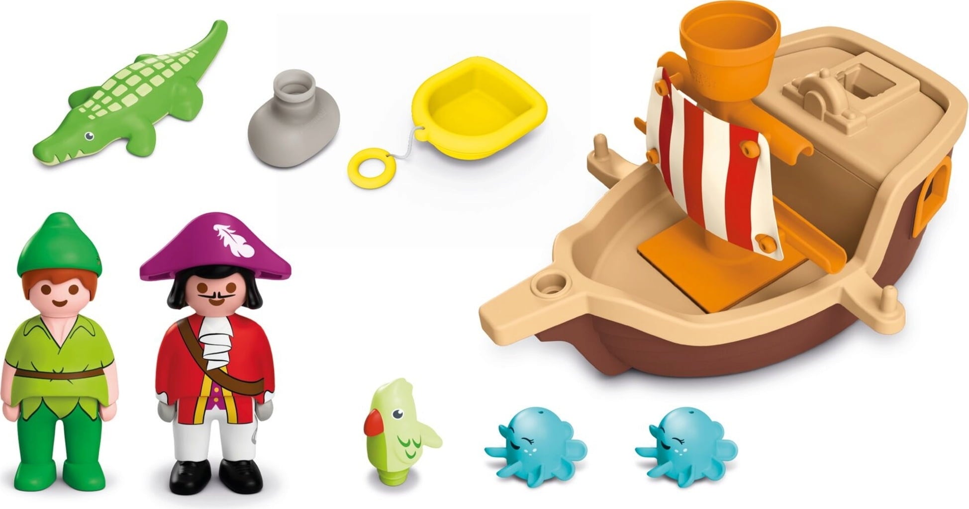 Vsebina: 1 Peter Pan, 1 kapitan Kljuka, 2 hobotnici, 1 krokodil, 1 papiga, 1 piratska ladja z jamborom, 1 čoln, 1 škropilni meh