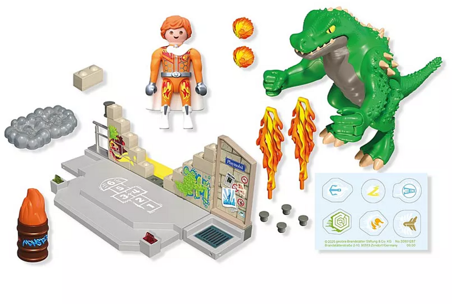 Vsebina: 1 človek, 1 velikanski kuščar, 1 velika osnovna plošča, 1 rampa, 2 elementa stranskih sten, 21 zidnih opek, 1 zunanja svetilka, 1 list z etiketo, 2 ognjeni krogli, 1 majhna osnovna plošča, 2 plamena, 1 pelerina, 1 pritrditev na skrinjo, 1 sod, 1 ogenj, 2 rastlini