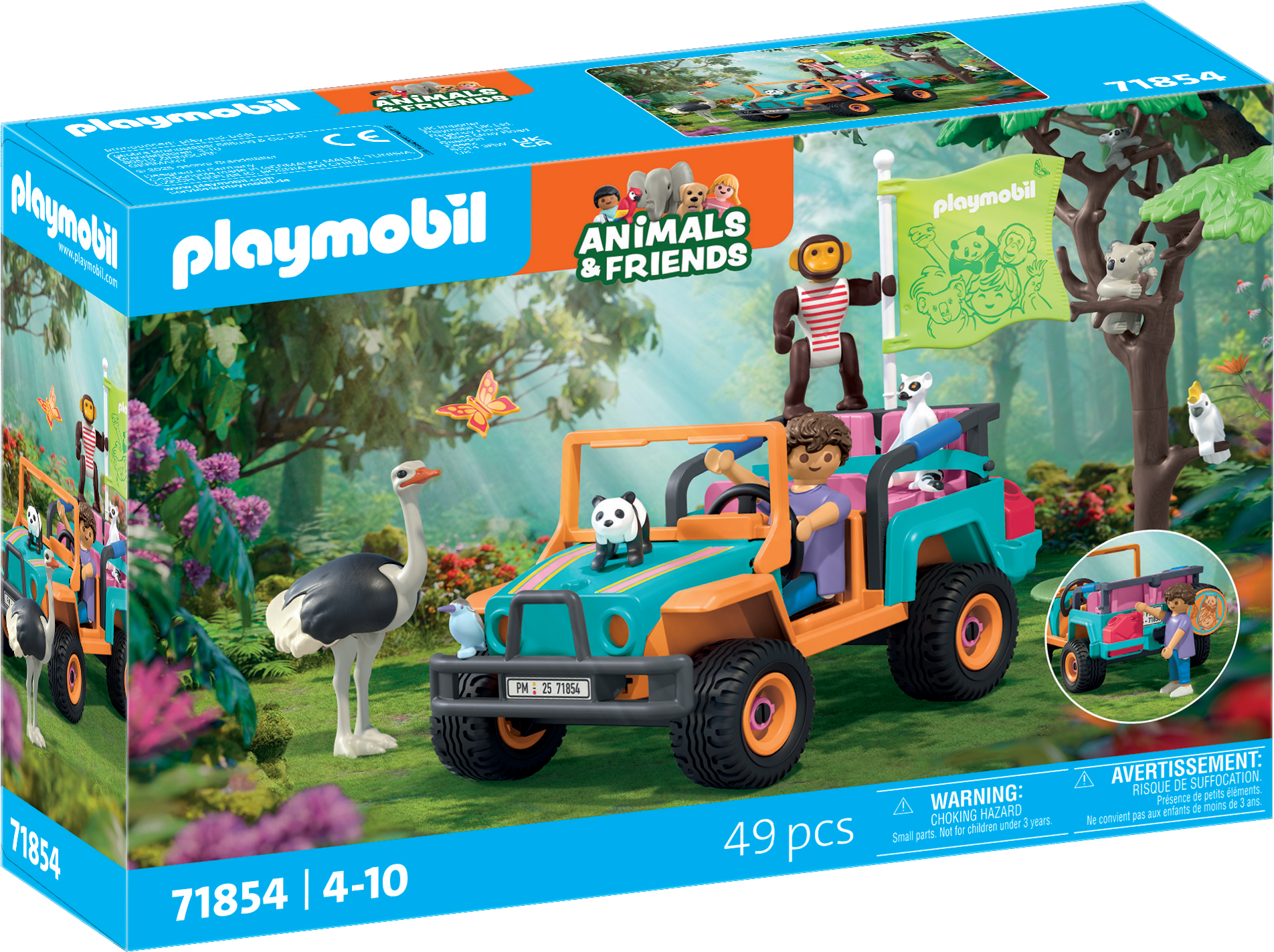 Vsebina: 1 terensko vozilo z zastavico, 1 drevo s podstavkom, 1 ptičje gnezdo, 1 posoda za bencin, 1 varnostni pas, 1 figurica, 1 noj, 1 opica, 1 mladič pande, 1 lemur, 1 mati koala z mladičem, 1 ptica, 1 metulj