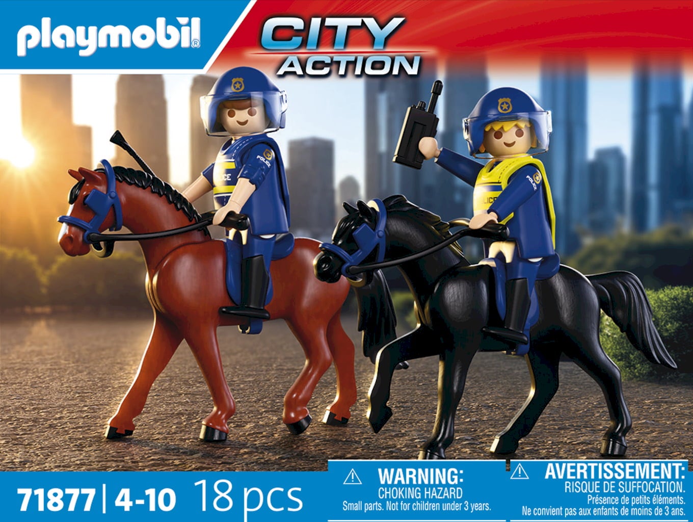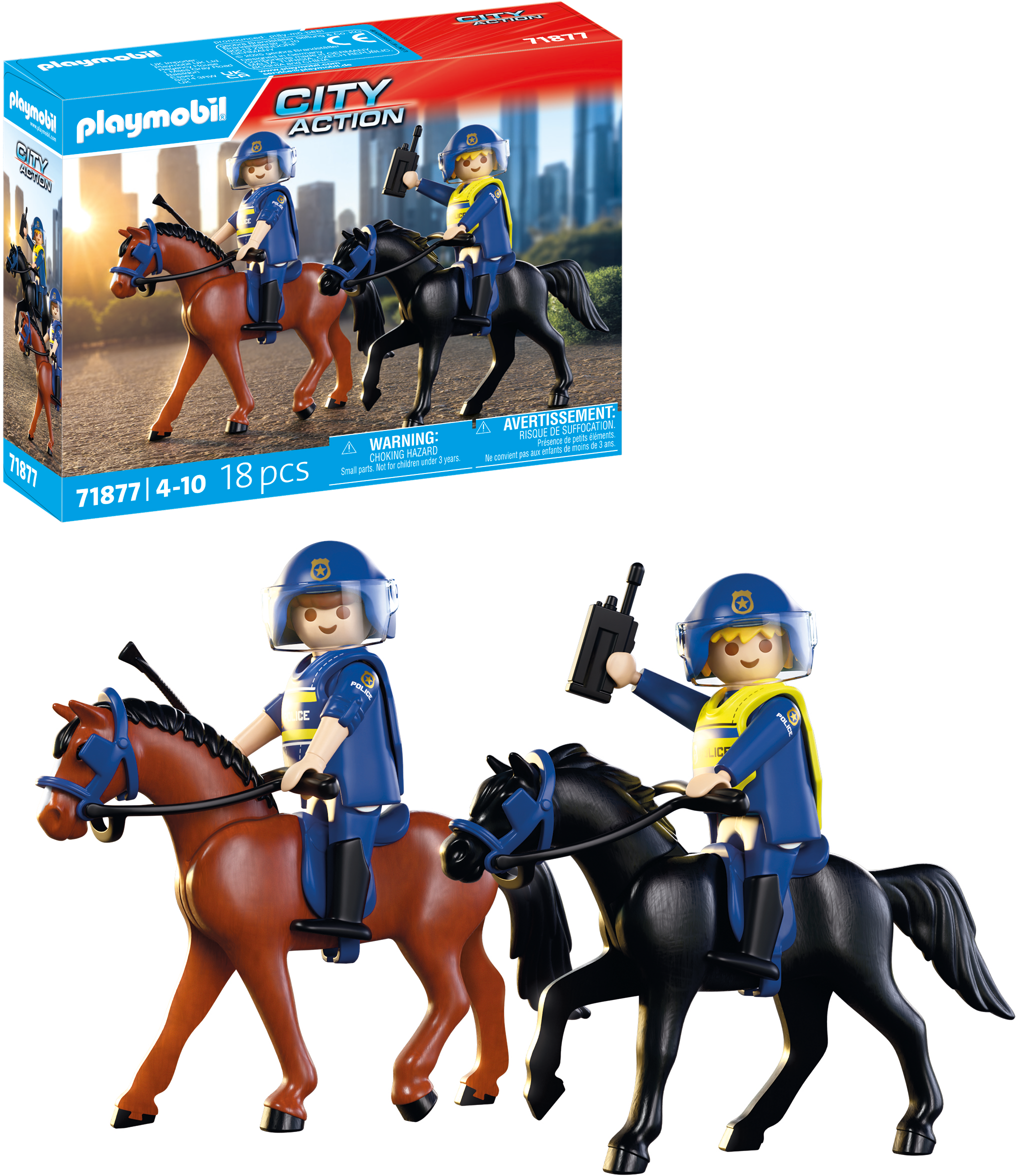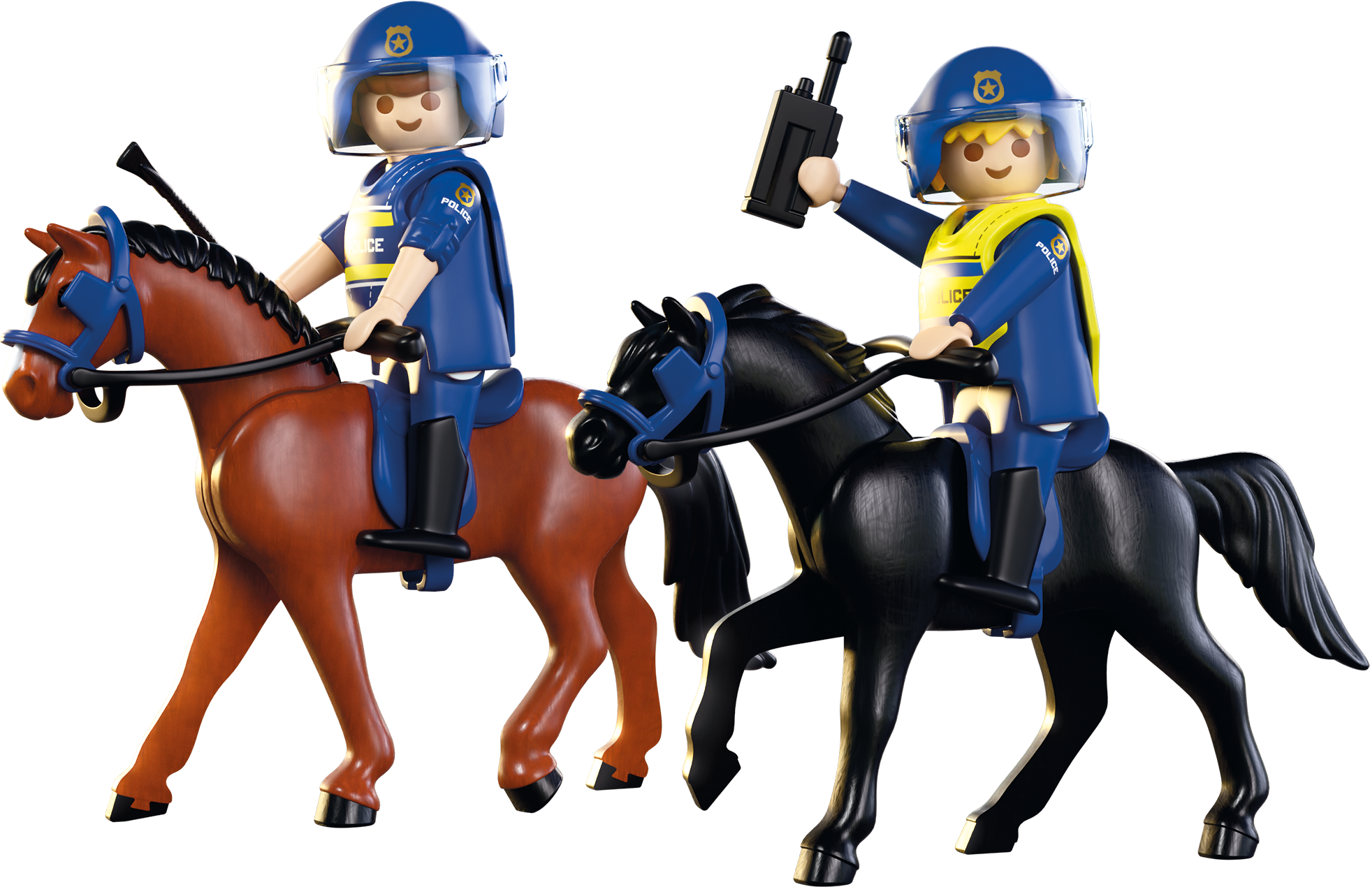 Prihajajo štirinožni policisti! S konjeniško enoto PLAYMOBIL dva policista na dveh čudovitih konjih zagotavljata varnost v mestu. Opremljena z radiem, svetilko, zaščitnimi jopiči in čeladami z vizirji sta pripravljena na vsako misijo. Popolno za male navdušence nad konji in nadobudne policiste!