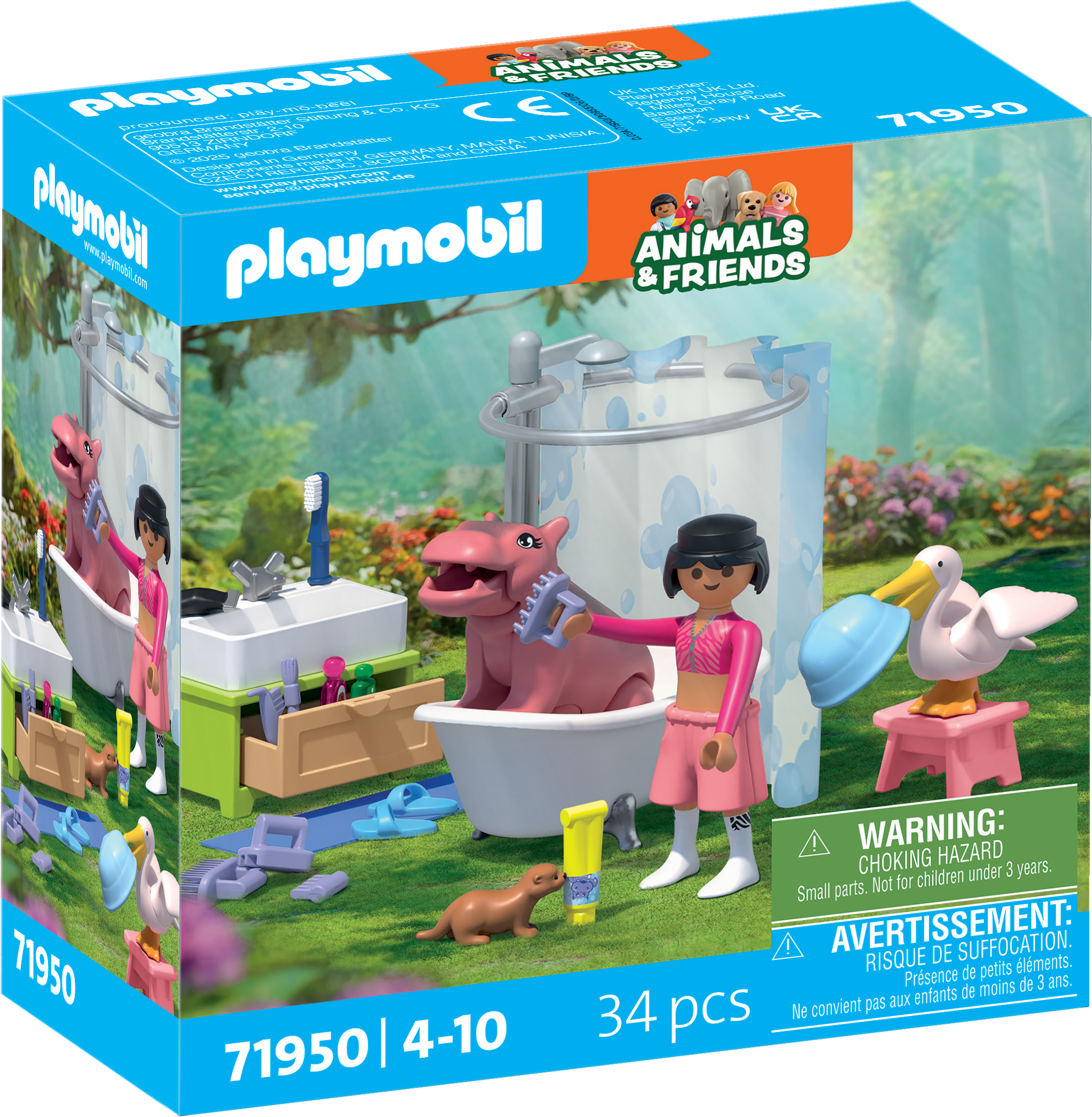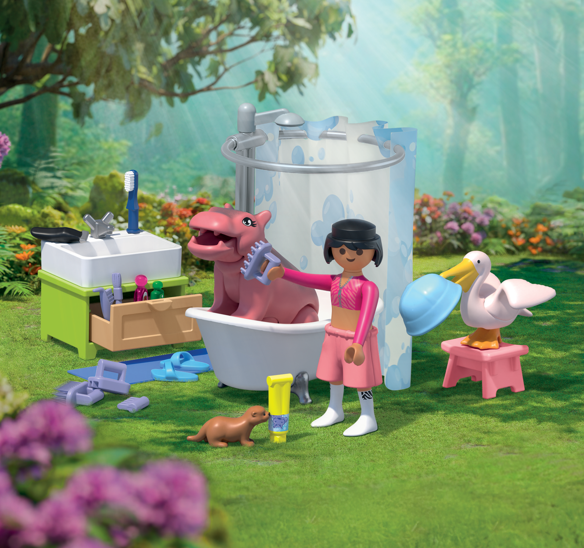Zabaven čas kopanja z mladičem povodnega konja, vidre in pelikana! Ljubitelj živali ljubeče skrbi za živali, šampon, milo in krtače pa zagotavljajo obilo zabave med igro. Popolno za male ljubitelje živali, ki želijo združiti čas kopanja s pustolovščino.