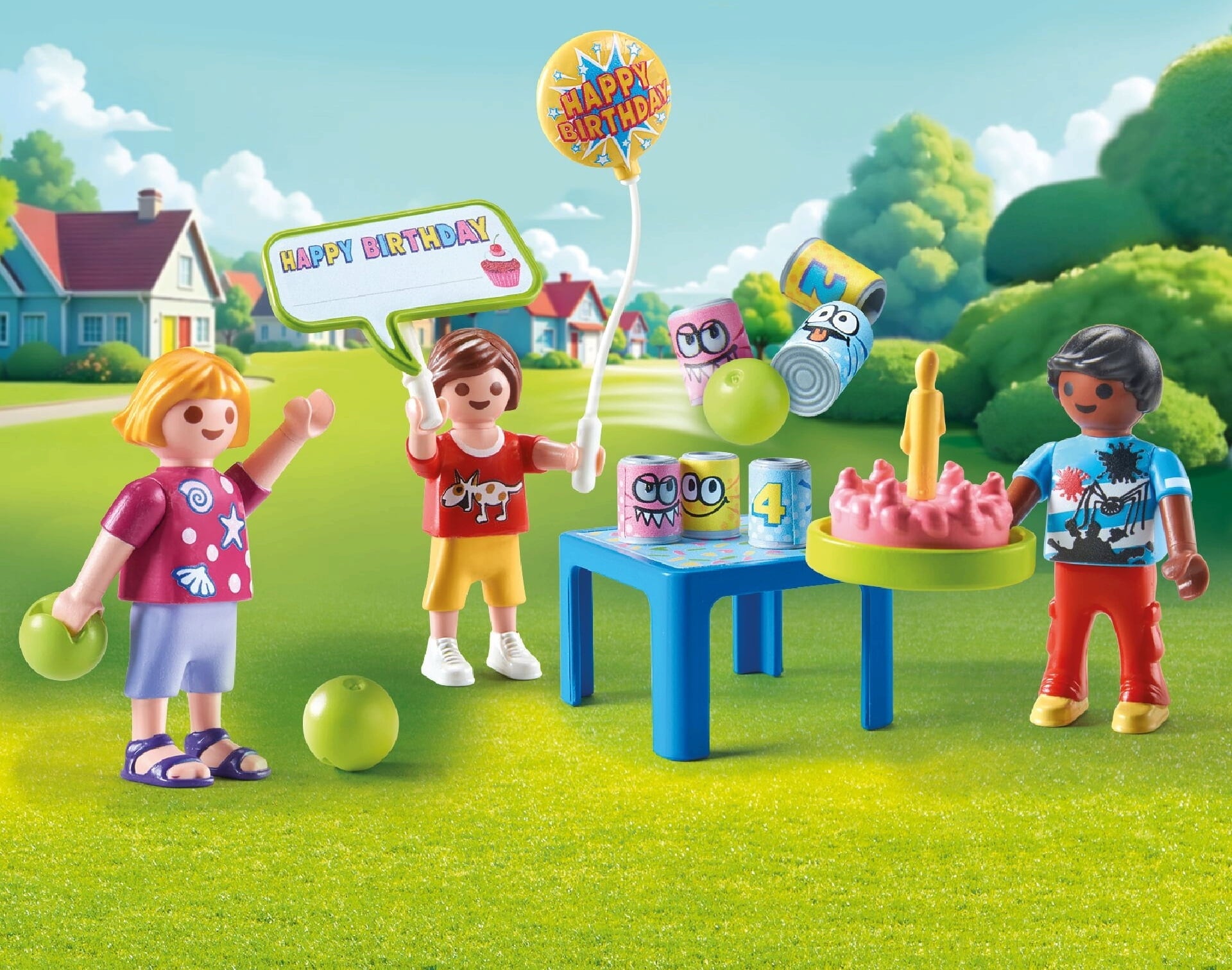 Vsebina: 1 deklica, 2 dečka, 1 majhna mizica, 6 pločevink, 3 žoge, 1 balon, 1 rojstnodnevna torta s svečko, 1 tablica (napis), ki jo je mogoče personalizirati