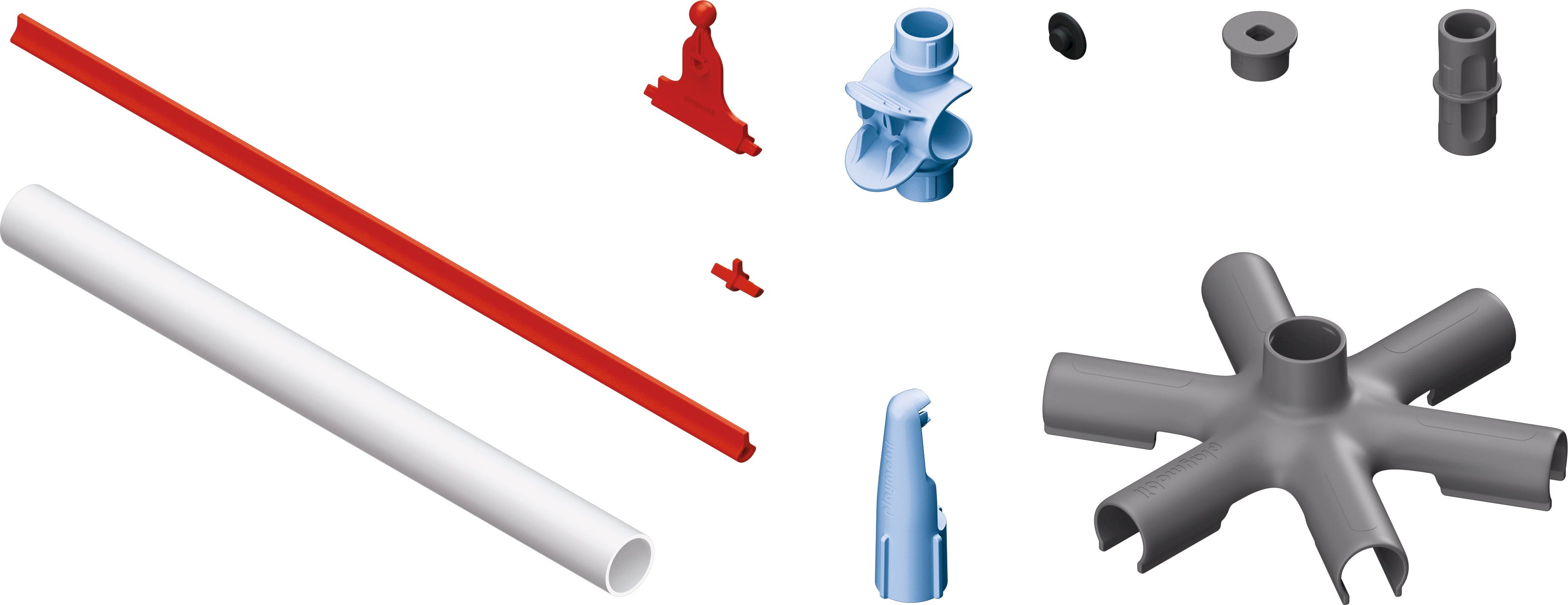 Vsebina: 2 nogi, 6 cevi in priključkov za cevi, 2 pokrovčka za cevi, 5 objemk, 3 adapterji, 3 adapterske tirnice s krogličnim sklepom, 4 tirnice, 2 priključka za tirnice