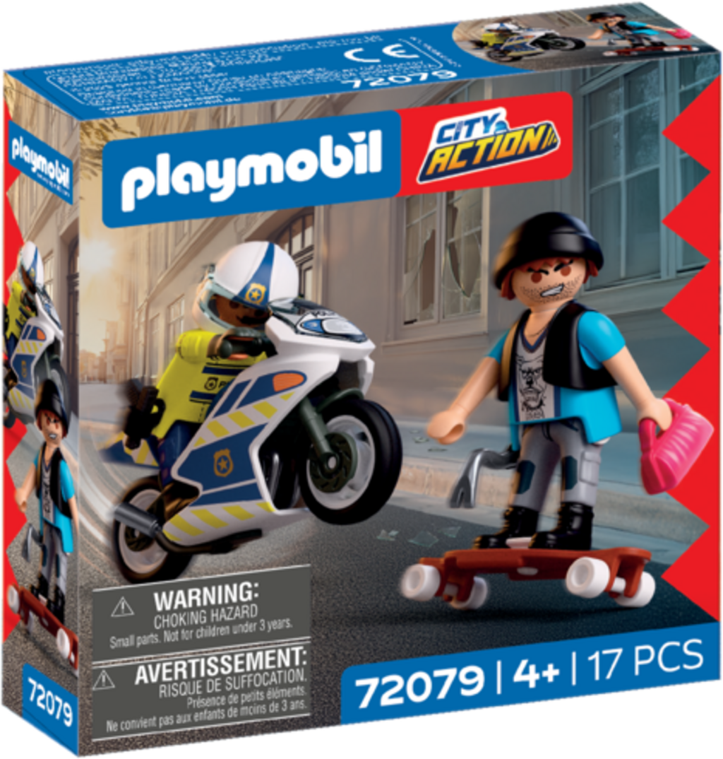 Policist lovi tatu po mestu, potem ko ta ukrade torbico. Z motorjem, dolgo desko in obilico dodatkov je mogoče poustvariti akcijske prizore. Komplet ponuja vznemirljive možnosti igranja vlog in zagotavlja nešteto dogodivščin v svetu PLAYMOBIL.