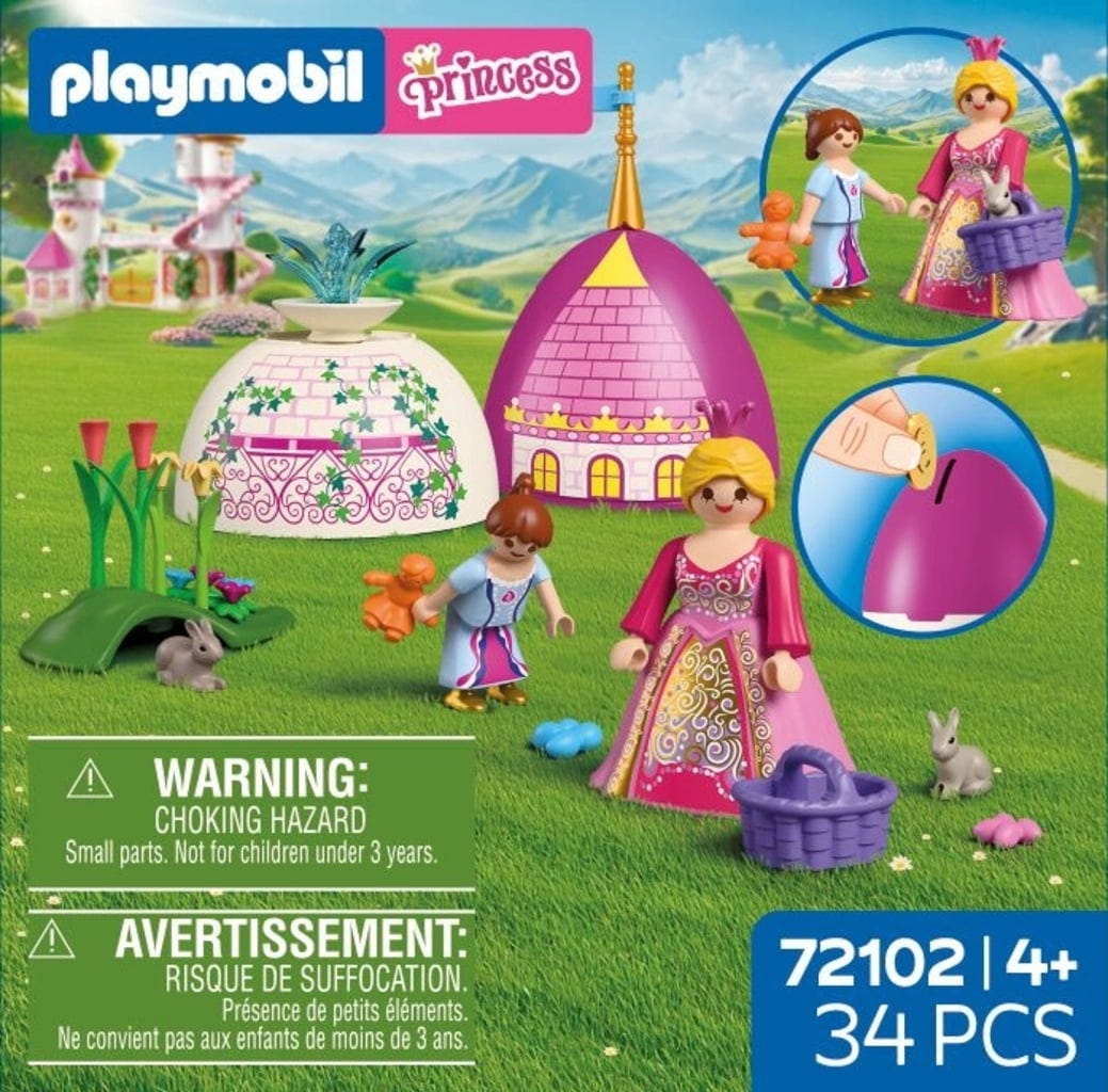 Velikonočna čarovnija v grajskem vrtu! PLAYMOBIL Play Egg Princesa popelje otroke v pravljični svet: velika in mala princesa skupaj iščeta barvita velikonočna jajca, odkrivata prikupne zajčke in se igrata med vodometom, cvetlicami in vzpenjalkami.