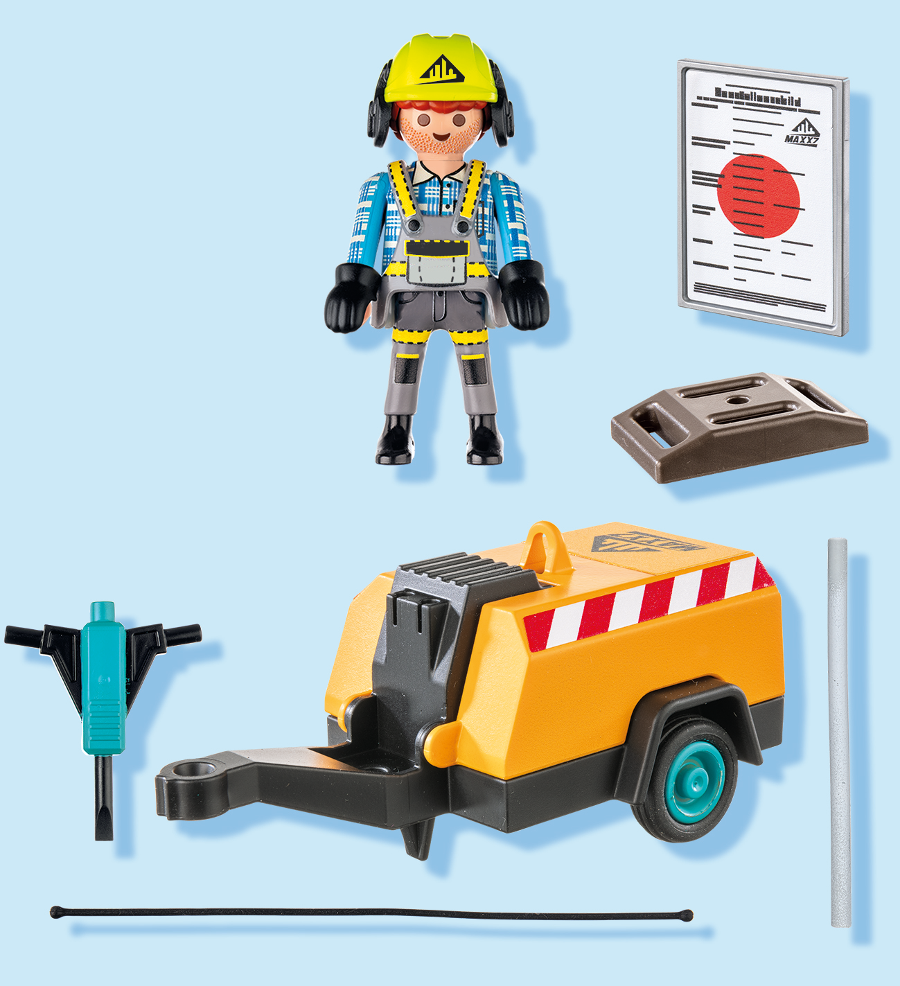 Vsebina: 1 človek z gradbeno čelado, 1 kompresor s priključkom za prikolico, 1 cev, 1 dleto, 1 znak za gradbišče s podstavkom