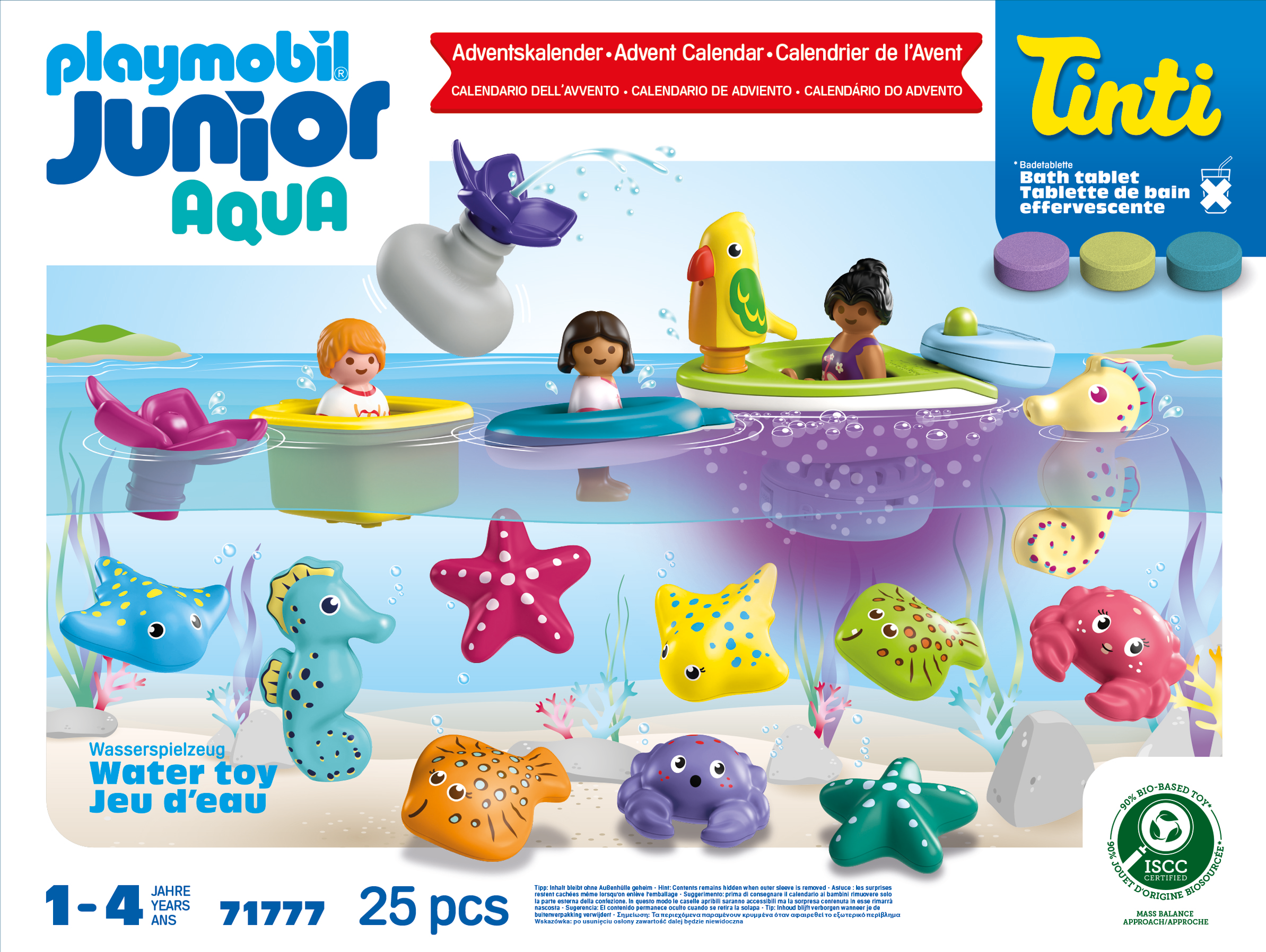 Z adventnim koledarjem PLAYMOBIL "JUNIOR & Tinti: Pisana kopalna zabava" bo predbožični čas postal vesela pustolovščina za malčke, stare 1 leto in več. V sodelovanju s podjetjem Tinti koledar ponuja 24 ljubeče oblikovanih presenečenj, ki združujejo igro, zabavo in kopanje - kot nalašč za male raziskovalce. Pričakujte plavajočo ladjico z vgrajeno komoro za kopalne tablete Tinti, ljubke vodne živali, figure za brizganje in druge pripomočke za domišljijske pustolovščine v kopeli. Priložene tablete Tinti obarvajo vodo in širijo prijeten vonj - veččutna izkušnja za najmlajše.