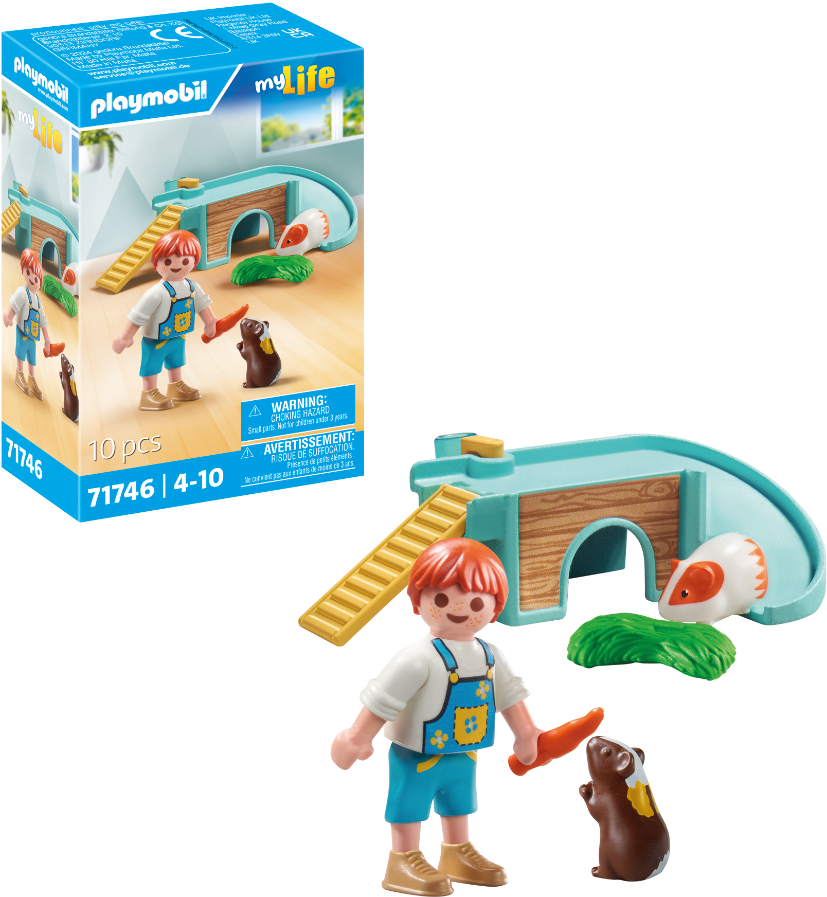 Vsebina: 1 deček, 1 stoječi morski prašiček, 1 sedeči morski prašiček, 1 hišica za glodavce, 1 korenček, 1 šop trave, 1 stopnice za morske prašičke, 1 steklenička za vodo za morske prašičke
