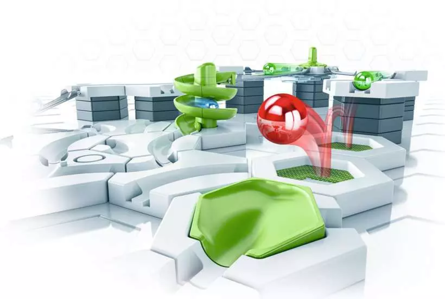 V središču tega kompleta sta dva spektakularna akcijska elementa: spirala omogoča kroglicam, da z vrtoglavo hitrostjo premagujejo višinske razlike. Ker je njeno višino mogoče individualno nastaviti, se popolnoma prilagodi vsaki konstrukciji, ki jo otroci oblikujejo. Trampolin pa v igro vnese povsem novo raven energije. Otroci lahko eksperimentirajo s tem, kako visoko in daleč lahko kroglice skočijo, in na lastne oči izkusijo zakone gravitacije.