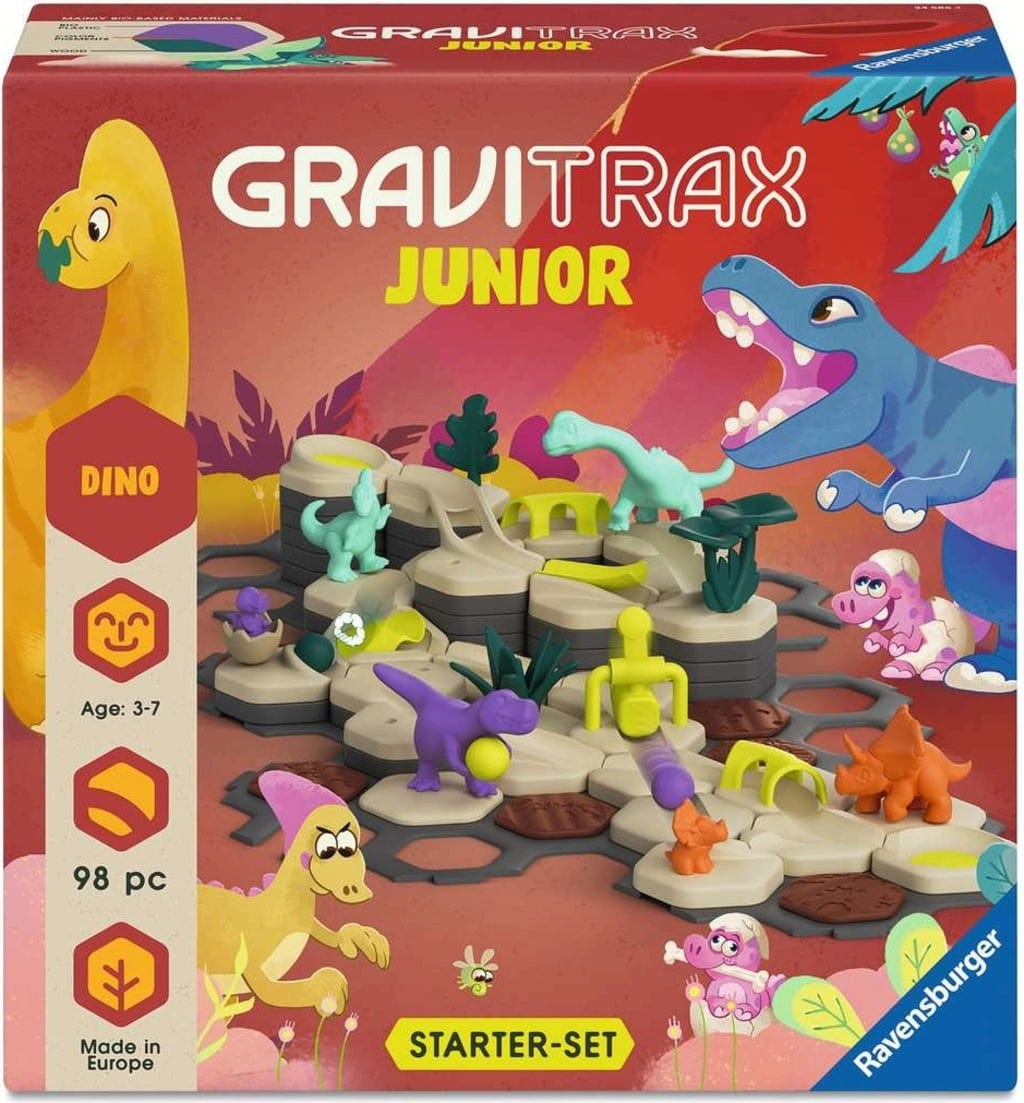 Stopite nazaj v čas! GraviTrax Junior Dino, začetni set L ponuja vse, kar mladi raziskovalci, stari 3 leta in več, potrebujejo za izgradnjo svojega prvega prazgodovinskega sveta. S tem kompletom otroška soba postane kulisa za hitro kotaleče se frnikole in impresivne dinozavre.
