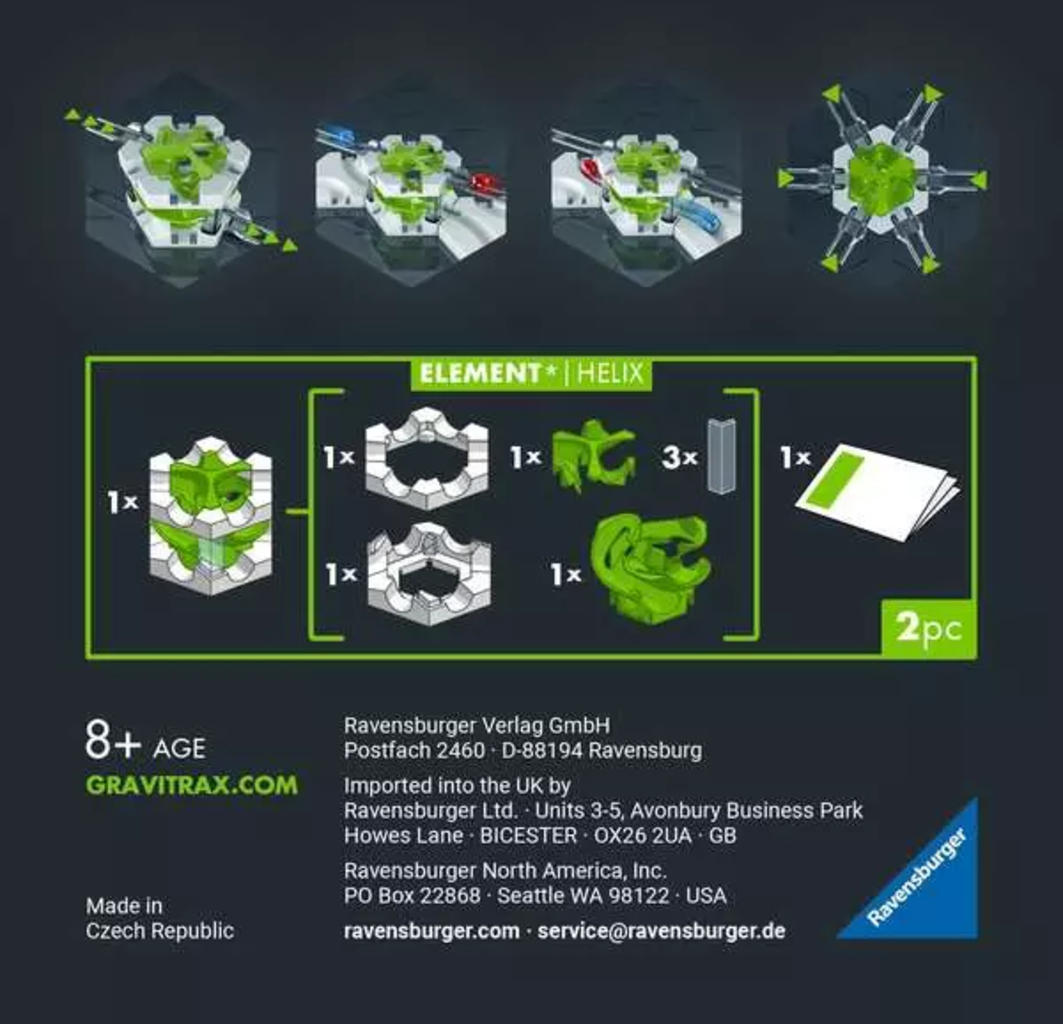 Helix ustvarja veliko aktivnosti na stezi: ko se žogica skotali v element, izstopi na nižji ravni. Posebnost je njena ogromna zmogljivost, saj lahko po kamnu hkrati potuje do šest žogic. Vaši otroci se bodo naučili načrtovati svoje steze bolj kompaktno in strateško, da bi optimalno upravljali prometni tok. To ne spodbuja le prostorsko razmišljanje, temveč tudi oprijemljive fizikalne principe z vsakim tekom.