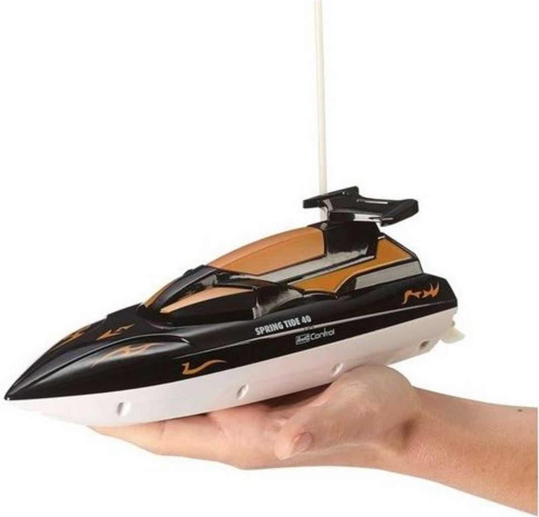 Zabaven tekmovalni čoln za bazen ali jezero. Zmogljivi elektromotorji ga dobesedno poganjajo čez valove. Velik trup preprečuje prevračanje. MHz 2-kanalni daljinski upravljalnik udobno leži v roki in zagotavlja popoln nadzor.
