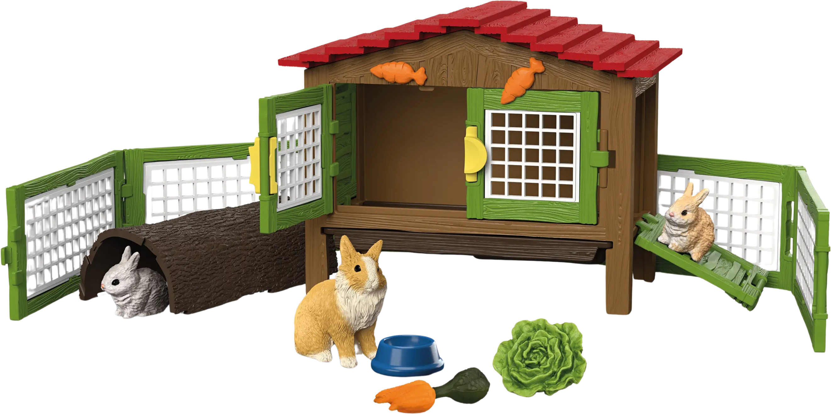 V skrbno oblikovanem kunčjem hlevčku Schleich se levjegriva kunčica in njena dva mladiča počutijo naravnost odlično. Tukaj se lahko spuščajo po toboganu, plazijo skozi tunele in se igrajo na ograjenem prostoru. Po igri jih čaka sveža hrana in prijeten kotiček za počitek. Podrobno zasnovan komplet oživi kmetijo in zagotavlja ure in ure domiselne zabave.