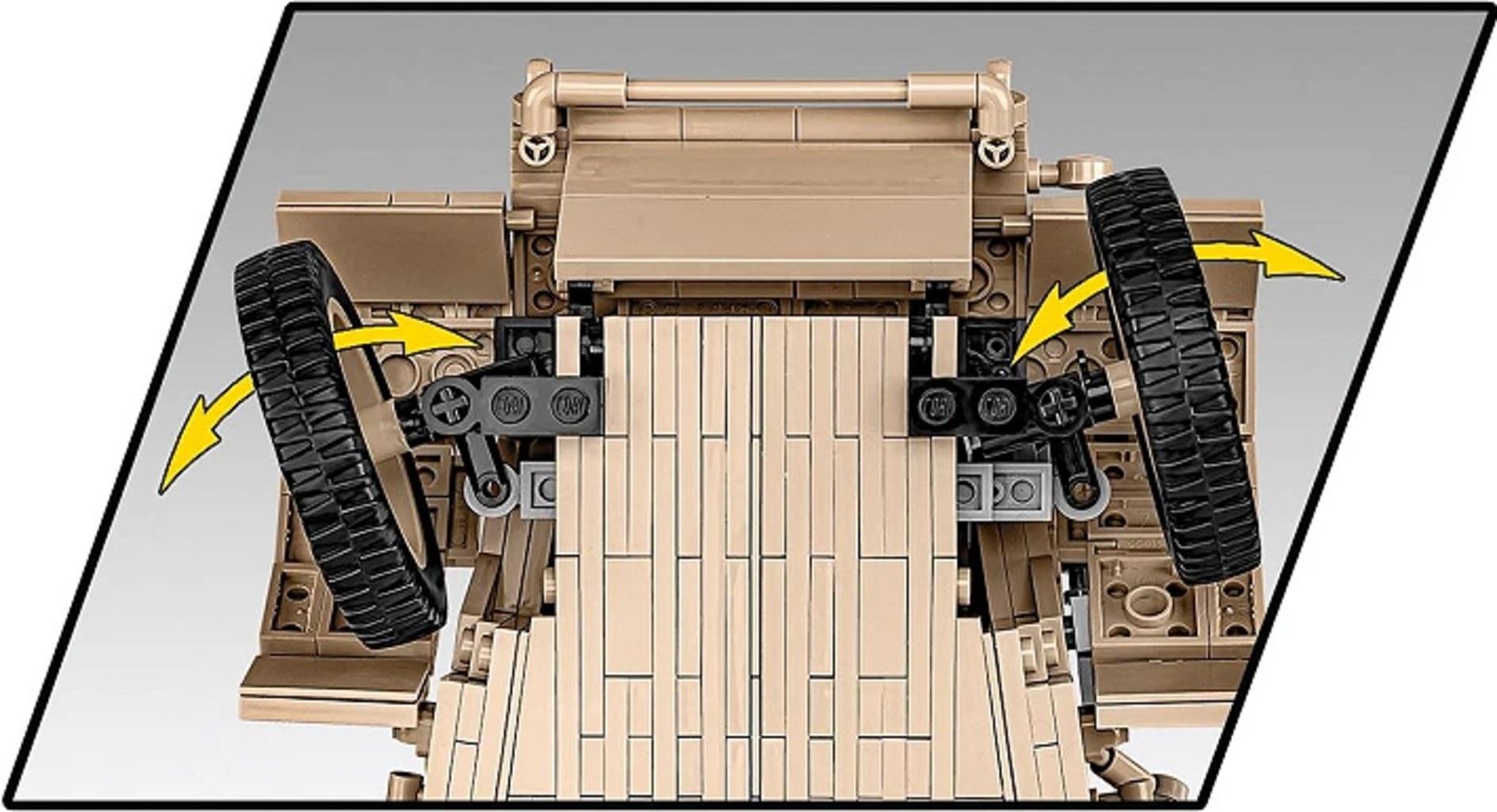 Zahvaljujoč delujočemu krmilnemu mehanizmu lahko neposredno premikate kolesa, robustna konstrukcija in visokokakovostni odtisi pa zagotavljajo prvovrstno izvedbo brez nalepk. Kot ponosni razstavni eksponat ali za večurno zabavo pri ročnem delu - ta mogočna terenska klasika prinaša pravi del zgodovine tehnike naravnost v vašo sobo!
