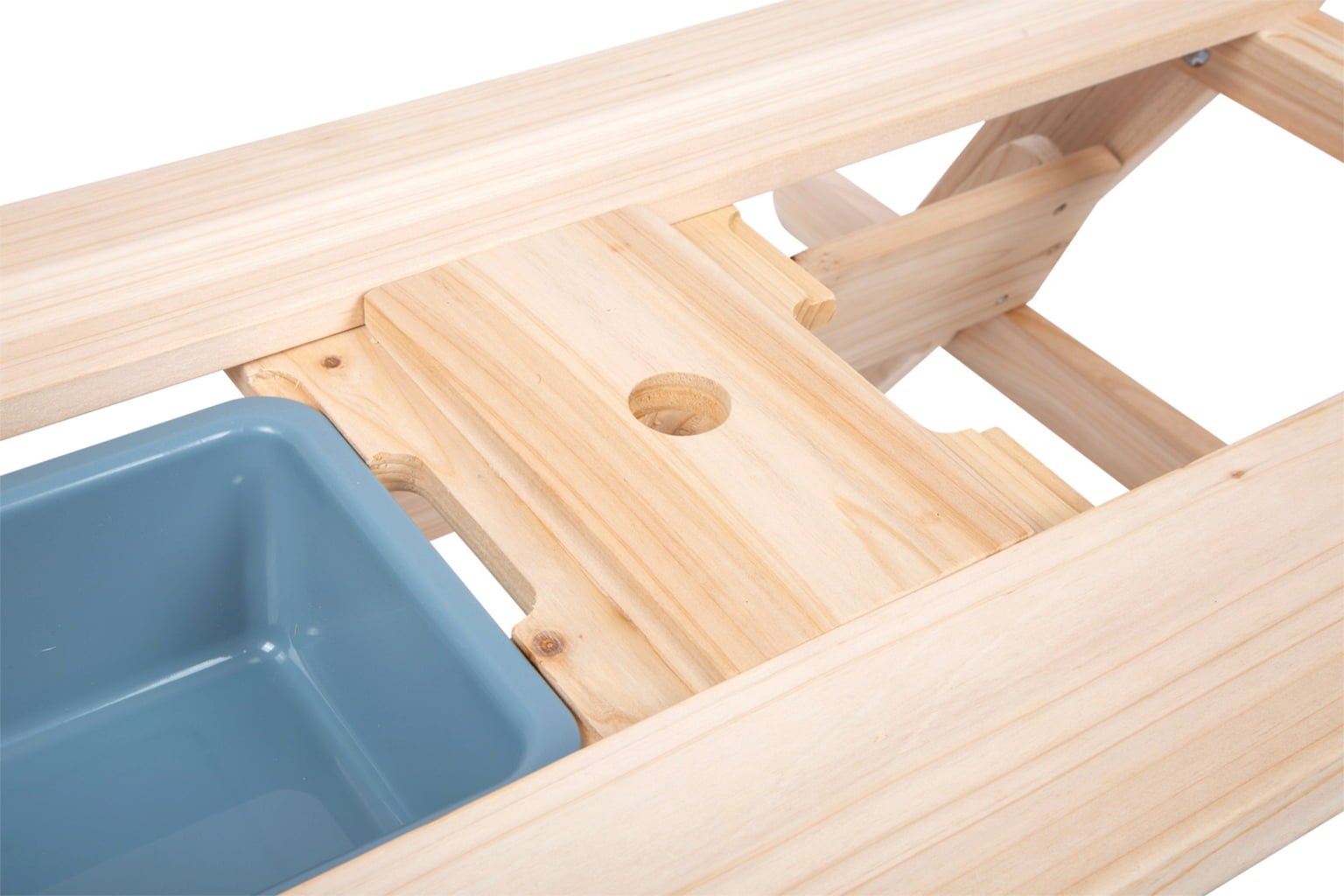 Ta piknik miza iz neobdelanega, vremensko odpornega masivnega lesa je popoln prostor za male raziskovalce za igro in packanje. Z nekaj preprostimi potezami se miza spremeni v blatno mizico: dve odstranljivi plošči na vrhu omogočata dostop do dveh trpežnih plastičnih posod, ki vsaka sprejmeta približno 3 litre – popolno za igro z blatom, peskom ali zbiranje naravnih materialov. Sedežne klopi so zložljive, zato lahko otroci izberejo, ali želijo pri mizi sedeti ali stati. Na sredini mize je tudi priročna odprtina za sončnik, ki nudi prijetno senco med igro.