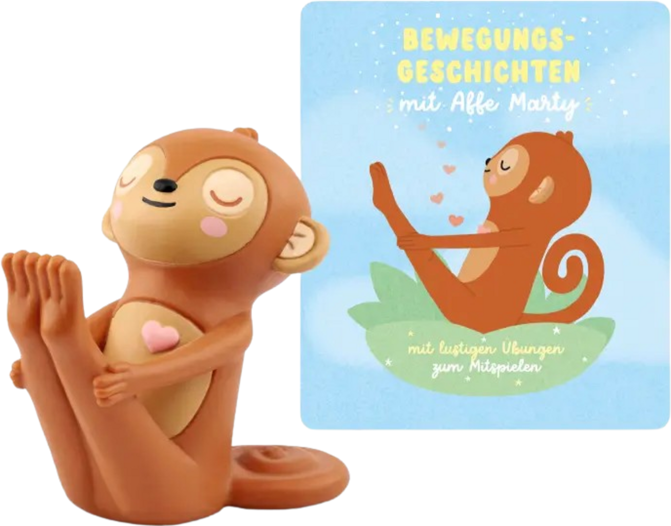 Ta Tonie je idealen za ciljno sproščanje vse te energije. S številnimi vajami in gibalnimi igrami predrzna opica Marty spodbuja otroke, da se pridružijo. Na srečo ima energična mala opica prijatelja in veliko drugih živali okoli sebe, ki ji pokažejo, kako usmerjati svojo bujno željo po gibanju in hkrati najti nekaj miru in tišine. Vadba in sprostitev sta za otroke enostavna!