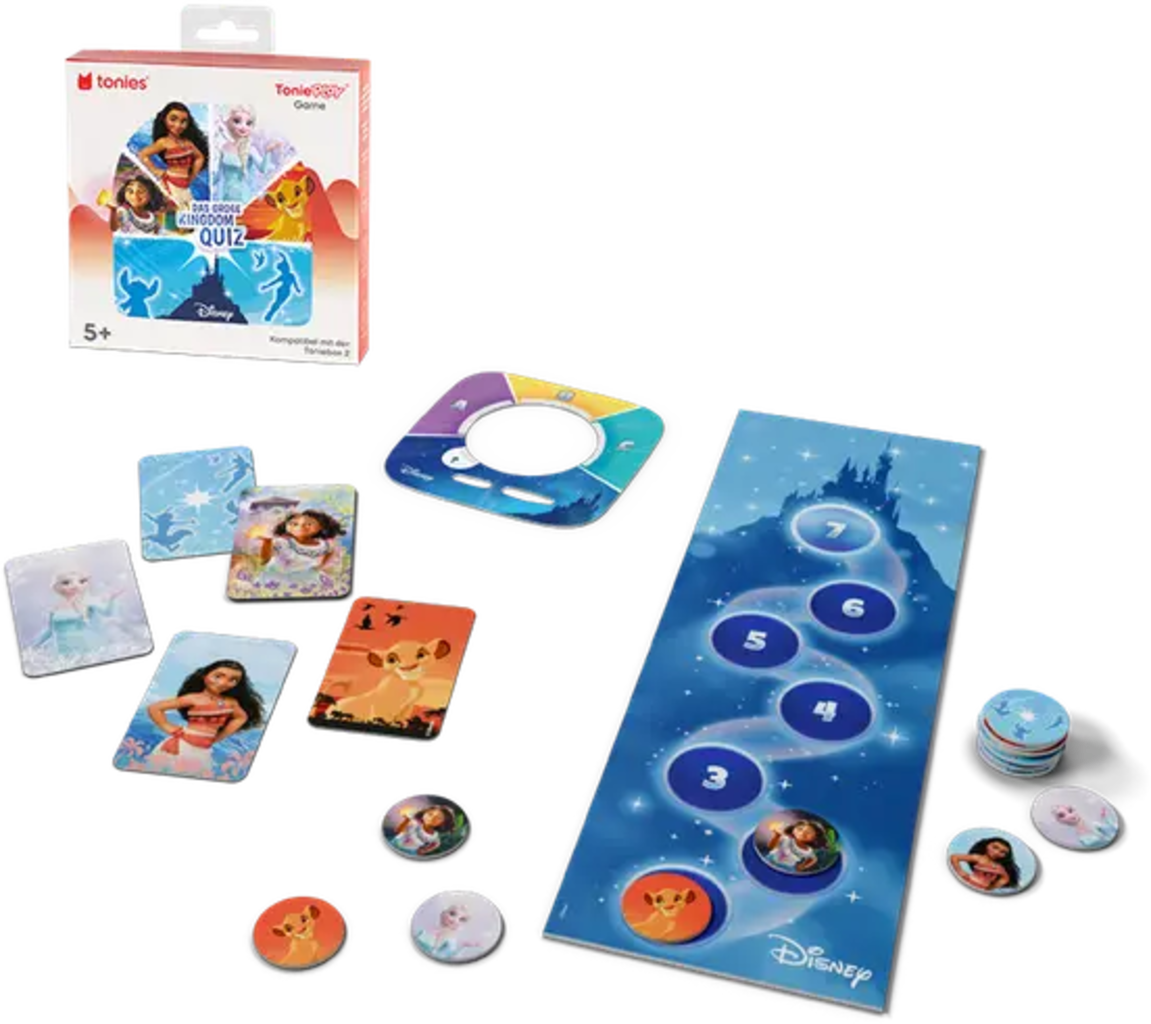 V tej vznemirljivi igri igre Tonieplay boste preizkusili svoje znanje z več kot 500 vprašanji o klasičnih in novih uspešnicah, kot so Levji kralj, Ledena kraljica, Vaiana in Encanto. Posebna naključna karta poskrbi za dodatno raznolikost s presenetljivimi vprašanji o likih, kot so Robin Hood, Peter Pan in Stitch. Otroci, stari pet let in več, lahko sami trenirajo svoj spomin ali pa se v razburljivem tekmovanju pomerijo s prijatelji in vso družino. Zberite največ žetonov kviza na igralni plošči in postanite nepremagljivi Disneyjev prvak! Za začetek interaktivne igre in tapkanje po karticah potrebujete le napravo Toniebox 2 in posebej na voljo krmilnik Tonieplay.