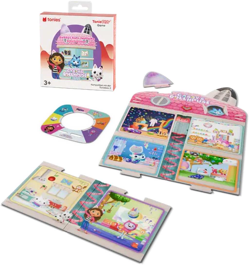 S to interaktivno igro Tonieplay se otroci potopijo naravnost v barvit svet "Gabbyjine hišice za punčke". Pustolovščina združuje vznemirljivo zvočno zabavo z edinstveno sestavljanko na igralni plošči, ki se spremeni v Gabbyjino podrobno izdelano hišico za punčke kar v otroški sobi. Na razburljivem lovu za zakladom igralci po sobah iščejo skrite predmete. A to še ni vse: pomagajte nagajivemu Ratkatzu pri njegovi zapleteni misiji s sendviči in pri tem odklepajte še veliko drugih presenečenj. Ob spremljavi izvirnih pesmi iz priljubljene serije ta igra ponuja nešteto ur zabave, odkrivanja in ugankarskega navdušenja. Enostavno položite ploščo na napravo Toniebox 2, aktivirajte krmilnik Tonieplay, ki je na voljo posebej, in čarobno iskanje se lahko začne.