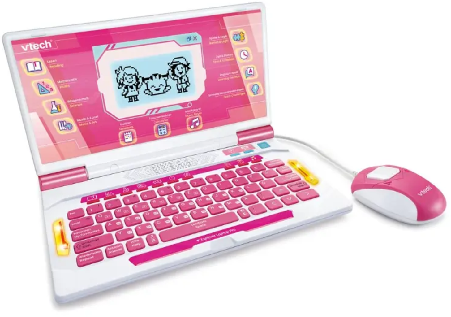 VTech Explorer Laptop Pro v roza barvi ponuja otrokom, starim 4 leta in več, interaktivni učni svet, poln zabave in znanja. Z več kot 160 izobraževalnimi igrami in dejavnostmi skozi igro spodbuja matematiko, jezik, logiko, ustvarjalnost in angleščino. Zaradi robustne zasnove, barvitega zaslona in otrokom prijazne tipkovnice je idealen za doma ali na poti in spremlja male raziskovalce med učenjem.