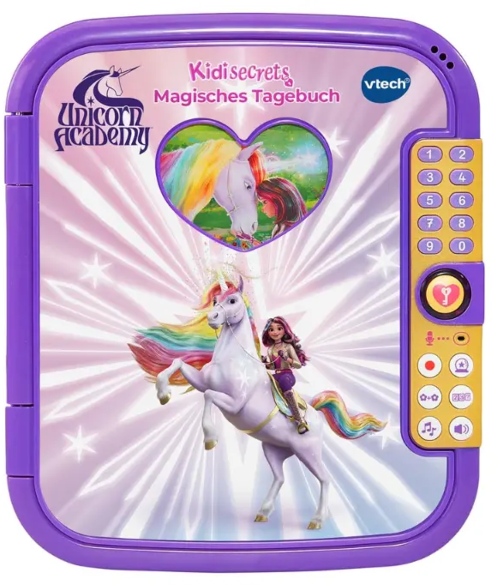 Dnevnik Unicorn Academy podjetja VTech otroke, stare 6 let in več, popelje v čarobni svet, poln magije in ustvarjalnosti. Z varnim številčnim geslom, interaktivnimi igrami in domišljijskimi dejavnostmi lahko misli, skrivnosti in ustvarjalne ideje zaščitite in odkrivate skozi igro. Dnevnik na igriv način spodbuja spomin, občutek za številke, glasbo in samozavest.