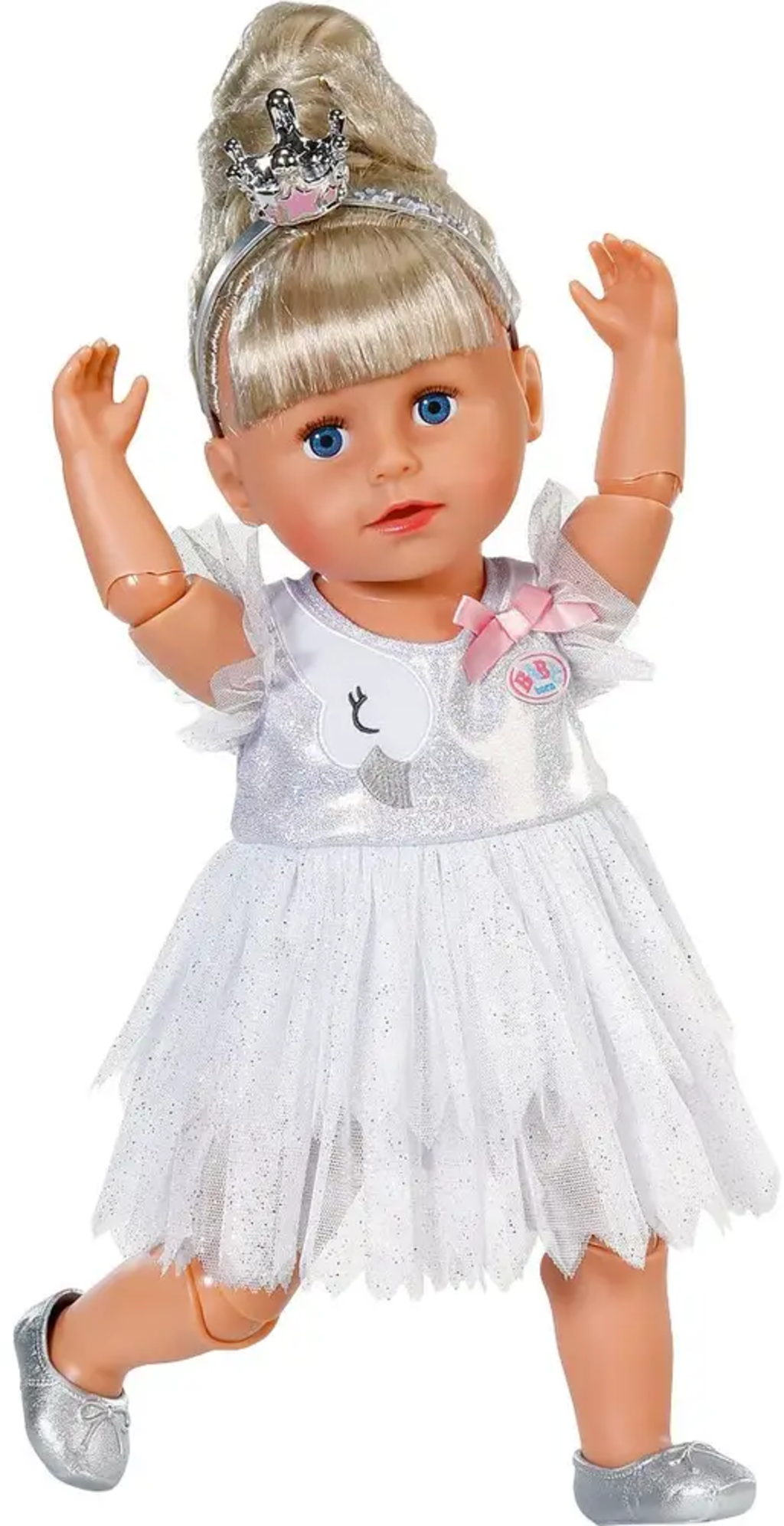 Z obleko balerine BABY born bo vaša punčka bleščeča plesna zvezda. Z ljubeznijo oblikovan komplet, ki ga sestavljajo bodi, krilo iz tila, naglavni trak in čevlji, spodbuja domišljijsko igro vlog in zagotavlja ure in ure zabave. Odličen za male plesalke, stare 3 leta in več.